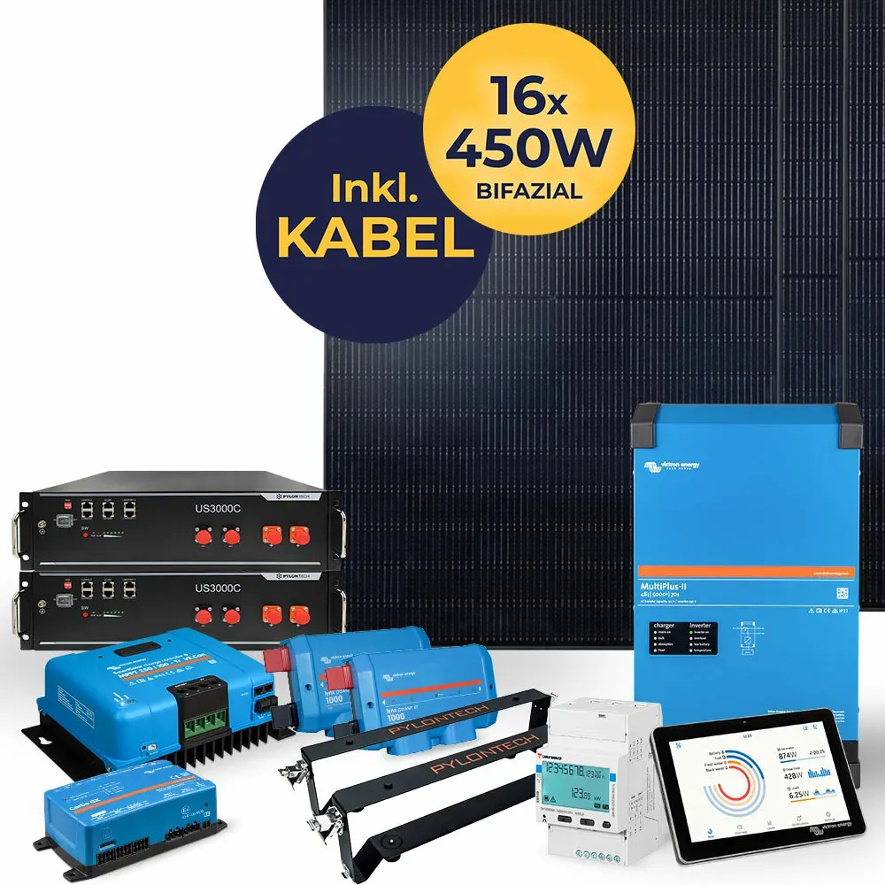 Kategorie: Wechselrichter - husatech - HUSATECH SunnyHome S 7,2 kW Photovoltaikanlage mit 7,1 kWh Speicher 1-phasig mit Victron Energy Multiplus II 48/5000/70-50 + MPPT 250/100 + 7200 Wp PV-Leistung und 7,1 kWh Pylontech US3000C Speicher Das Sorglos-Set All-In-One für kleine Ein- bis Zweipersonenhaushalte mit einem Jahresstromverbrauch von bis zu 3000 kW. Der Victron Energy MultiPlus II Wechselrichter ist das intelligente Gerät, welches eine zentrale Rolle im Stromnetz bei Dir zuhause spielt. Er wandelt den von Deiner Solaranlage erzeugten Gleichstrom in nutzbaren Wechselstrom für den Betrieb Deines Haushaltes um. Darüber hinaus kann er auch als Ladegerät für den Batteriespeicher dienen und bei Bedarf als unterbrechungsfreie Stromversorgung (USV) fungieren. So ist sichergestellt, dass Deine wichtigen Gerätschaften wie Sauerstoffgerät oder Kühlschrank auch bei einem Stromausfall weiterhin mit Energie versorgt werden! Der MultiPlus II ist so konzipiert, dass er je nach den Bedürfnissen automatisch zwischen den verschiedenen Funktionen wechseln kann, um eine zuverlässige Stromversorgung zu gewährleisten. Er lässt sich mit einem MPPT-Solar-Ladegerät oder einem Netz-Einspeise-Wechselrichter für PV-Anlagen kombinieren. Erzeugt die PV-Anlage mehr Energie als Du gerade verbrauchst, wird der überschüssige Strom in den Akku geleitet. Sobald die Sonnenverhältnisse nachlassen, wird nicht genügend Energie produziert, um den Eigenbedarf zu decken. Erst dann wird die gespeicherte Energie ... Dieses HUSATECH PowerSet ist die GX-Version des 3-phasigen Systems mit 19,2 kWh Pylontech US5000 Speicher und bietet erweiterte Überwachungs- und Steuerungsoptionen für größere Anlagen. ![]() ![]() HUSATECH PowerSet 3 Phasig mit Victron MultiPlus-II 48/5000/70-50 GX und 19,2 kWh Pylontech US5000 Speicher