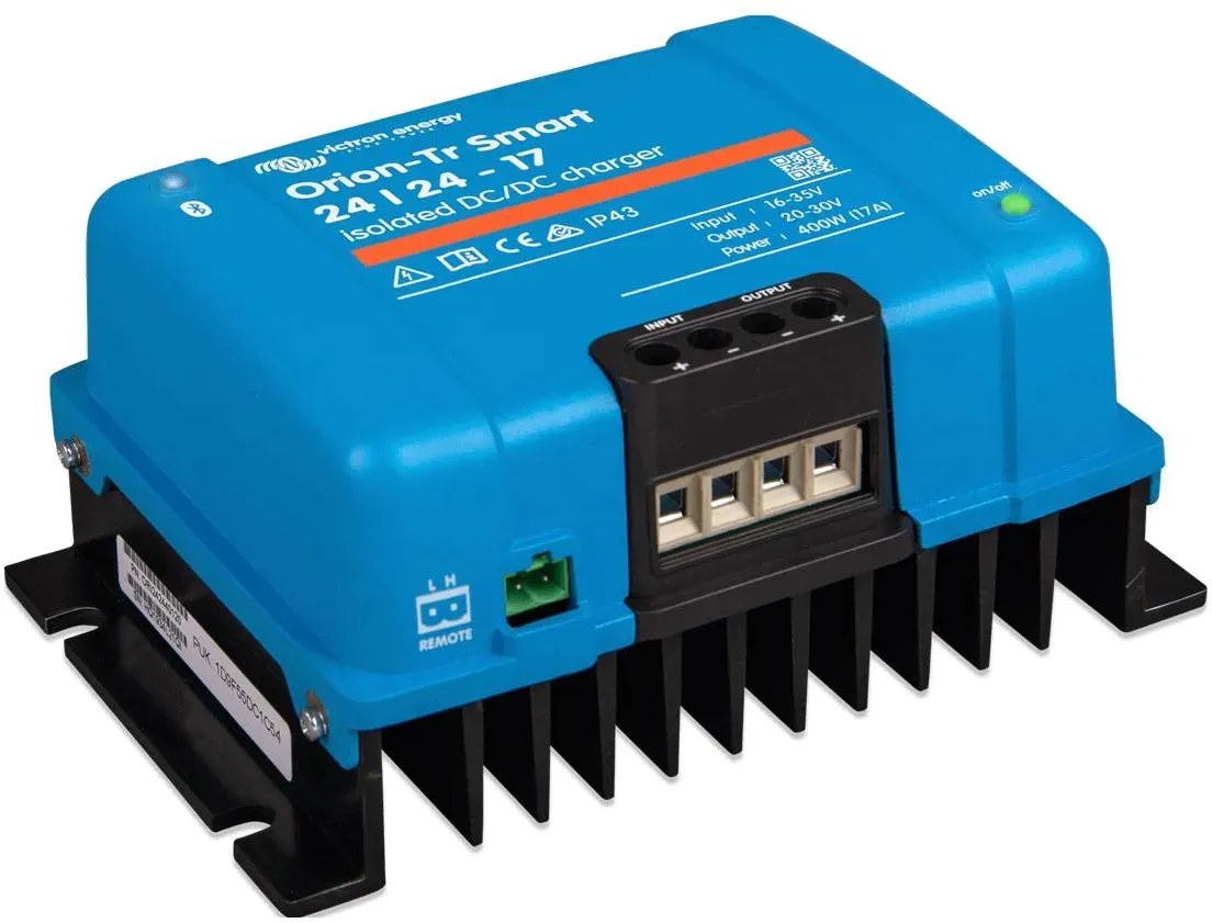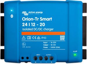 Gesamtsortiment Baumarkt + Garten Fahrzeug Fahrzeugzubehör Fahrzeugelektrik + Laden Batterieladegerät Autoteile, Zubehör und Styling - EAN:8719076046073 - Victron Orion Tr-Smart DC/DC Ladebooster Der Orion-Tr Smart DC/DC Ladebooster ist die smarte Lösung zum Laden Ihres E-Fahrzeugs. Das Ladegerät von Victron Energy kann als Ladegerät oder als Netzteil verwendet werden und eignet sich besonders für Lithiumbatterien. Es ist geeignet für Bluetooth Smart und vollständig programmierbar. Je nach den individuellen Bedürfnissen ist der Batterieladealgorithmus frei konfigurierbar oder es kann mit einer festen Ausgangsspannung gearbeitet werden. Dank intelligenter Lichtmaschinen bei Euro 5- und Euro 6-Motoren ist eine Motorlauferkennung möglich, sodass die Stromzufuhr nur bei laufendem Motor aktiv ist. Auf diese Weise wird einer unerwünschten Entladung der Starterbatterie vorgebeugt. Der Orion-Tr Smart Ladebooster ist mit moderner Bluetooth-Technologie ausgestattet. Damit lässt sich das Ladegerät einfach über das Bluetooth des Smartphones überwachen. Auch Softwareaktualisierungen und Änderungen in den Einstellungen können bequem vom Handy aus gesteuert werden. Fern-An- und -Abschaltung Das Ladegerät lässt sich mittels eines Schalters oder eines Relais-Kontakts am zweipoligen Stecker auch ferngesteuert ein- und ausschalten. Alternativ lässt sich auch Anschluss H (rechts) des Steckers zu einem B Pluspol oder Anschluss L (links) an den Minuspol schalten. Konstantstrom, ... Ein preiswerter isolierter DC/DC Charger mit 24/24-12A, der eine stabile 24V-Ausgabe aus einer 24V-Quelle ermöglicht. ![]() Wandler VICTRON ENERGY '»DC/DC Charger Victron Orion-Tr Smart 24/24-12 iso«', blau, B:18,6cm H:7cm L:13cm, Aluminium, Wandler