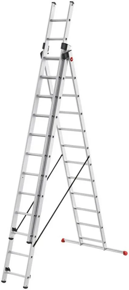 Leitern Werkzeug Hebearbeiten & Arbeiten in der Höhe Leitern Einfache & gerade Leitern Handwerkzeuge - EAN:4009199129703 - Krause Tribilo Alu Vielzweckleiter / Mehrzweckleiter 3-teilig 3x12 Sprossen Leiter Die dreiteilige Alu Mehrzweckleiter ist flexibel als Anlegeleiter, Schiebeleiter und Stehleiter mit ausschiebbarem Leiternteil einsetzbar. Beide Leiterteile sind auch einzeln einsetzbar. Das Innenteil der Leiter ist mit einer neu entwickelten Trigon-Traverse ausgestattet, die weiterhin eine Einzelnutzung des Innenteils ermöglicht. Durch die rundum profilierten Sprossen und rutschsicheren Zweikomponenten-Fußstopfen bietet die Alu Vielzweckleiter ein hohes Maß an Sicherheit. Ausstattung: Stabile Stahl-Führungsprofile ermöglichen das komfortable Ausschieben der Leiter Rundum profilierte Sprossen für sicheren Auf- und Abstieg Rutschsichere Zweikomponenten Fußstopfen: die harte Komponente sorgt für eine stabile Verbindung des Stopfens mit dem Holm, die weiche Komponente sorgt für hohe Haftreibung mit dem Untergrund und verhindert das ungewollte Wegrutschen der Leiter Selbstsichernde Einrasthaken - gefunden von Kelkoo ![]() ![]() Vielzweckleiter HAILO 'HobbyStep combi', rot (aluminiumfarben, schwarz, rot), B:19cm H:347cm L:48cm, Aluminium, Kunststoff, Leitern, Aluminium Kombileiter 3-teilig 3x12 Sprossen