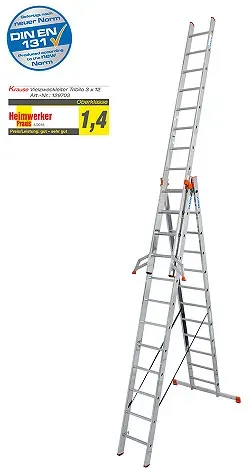 17 Händlerangebote bei billiger.de - Kategorie: Leitern - Krause - Marke: KRAUSE Farbe: silberfarben Serienname: MONTO Tribilo Gewicht: 25 kg Einsatzbereich: außen Geeignet für: Dreiteilige Aluminium-Vielzweckleiter, einsetzbar als Anlege-,Schiebe- und Stehleiter mit ausschiebbarem Leiternteil (3 x 12 Sprossen). Technische Daten Tragfähigkeit (max.): 150 kg Leiterart: Gelenkleiter, Vielzweckleiter Maßangaben Höhe: 830 cm Breite: 48 cm Sprossenabstand: 28 cm Arbeitshöhe: 930 cm Stufentiefe: 2,8 cm Standhöhe (max.): 730 cmMaterialangaben Material: Aluminium Funktionen und Ausstattung Zusammenklappbar: Ja Witterungsbeständig: Ja Schiebbar: Ja Rutschsicher: Ja Anzahl Sprossen: 36 Normen DIN/ISO/EN: EN131 Inhaltsangaben Verpackungsinhalt: 1 Hinweise Hersteller (Details siehe PDF ' hinweis') Lieferung Lieferumfang: 1x Vielzweckleiter Tribilo - GTIN:4009199129703 ![]() ![]() Krause Monto Tribilo mit Treppenfunktion 3 x 12 Sprossen 129789