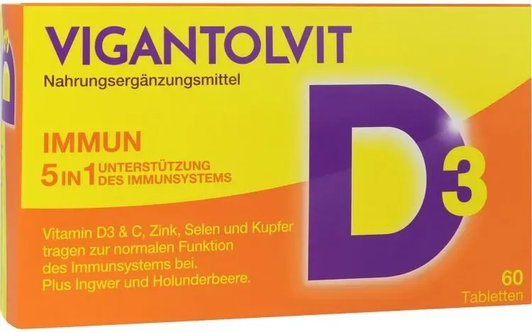 0,25 /Stück - Kategorie: Arzneimittel - Vigantolvit - GTIN:8006540077245 - PZN:16752328 - Anwendungsgebiet von Vigantolvit Immun FilmtablettenVigantolvit Immun Filmtabletten sind ein Nahrungsergänzungsmittel mit Vitamin D3, Vitamin C, Zink, Selen und Kupfer Plus Ingwer und Holunderbeere. Von VIGANTOLVIT , dem Marktführer** für Vitamin-D-Produkte mit mehr als 9 n Expertise. VIGANTOLVIT IMMUN ist ein Nahrungsergänzungsmittel mit hochdosiertem Vitamin D3 (2000 IE) in Kombination mit Vitamin C, Selen, Zink und Kupfer zur täglichen Einnahme eine 5-in-1-Formel, die zur Unterstützung des Immunsystems Ihres Körpers entwickelt wurde.* Es enthält hochdosiertes Vitamin D3 für ein gesundes Immunsystem*. Zudem wurde diese 5-in-1-Kombination mit den Mineralien Selen, Zink und Kupfer formuliert, die Zellen vor oxidativem Stress schützen sollen, und sie enthält Vitamin C zur Erhaltung eines normalen Energiestoffwechsels. Enthält zusätzlich Ingwer- und Holunderextrakte. Die 5-in-1-Formel mit hochdosiertem Vitamin D3 (2000 IE) für ein gesundes Immunsystem* VIGANTOLVIT IMMUN* wurde mit hochdosiertem Vitamin D3 (2000 IE) in Kombination mit Vitamin C, Zink, Selen und Kupfer formuliert. Vitamin D3 spielt eine wichtige Rolle bei der Unterstützung der normalen Funktion des Immunsystems. Zusätzlich schützen die Mineralien Selen, Zink und Kupfer die Zellen vor oxidativem Stress, während Vitamin C dazu beiträgt den normalen Energiestoffwechsel zu erhalten. Diese 5-in-1 Kombination wurde von Ihrem ... Ein solides Angebot für die 60er Packung zu einem guten Preis. ![]() ![]() Vigantolvit Immun 60 ST