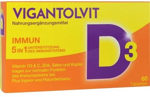 VIGANTOLVIT - EAN: 8006540077245 - Anwendungsgebiet von Vigantolvit Immun FilmtablettenVigantolvit Immun Filmtabletten sind ein Nahrungsergänzungsmittel mit Vitamin D3, Vitamin C, Zink, Selen und Kupfer Plus Ingwer und Holunderbeere. Von VIGANTOLVIT , dem Marktführer** für Vitamin-D-Produkte mit mehr als 9 n Expertise. VIGANTOLVIT IMMUN ist ein Nahrungsergänzungsmittel mit hochdosiertem Vitamin D3 (2000 IE) in Kombination mit Vitamin C, Selen, Zink und Kupfer zur täglichen Einnahme eine 5-in-1-Formel, die zur Unterstützung des Immunsystems Ihres Körpers entwickelt wurde.* Es enthält hochdosiertes Vitamin D3 für ein gesundes Immunsystem*. Zudem wurde diese 5-in-1-Kombination mit den Mineralien Selen, Zink und Kupfer formuliert, die Zellen vor oxidativem Stress schützen sollen, und sie enthält Vitamin C zur Erhaltung eines normalen Energiestoffwechsels. Enthält zusätzlich Ingwer- und Holunderextrakte. Die 5-in-1-Formel mit hochdosiertem Vitamin D3 (2000 IE) für ein gesundes Immunsystem* VIGANTOLVIT IMMUN* wurde mit hochdosiertem Vitamin D3 (2000 IE) in Kombination mit Vitamin C, Zink, Selen und Kupfer formuliert. Vitamin D3 spielt eine wichtige Rolle bei der Unterstützung der normalen Funktion des Immunsystems. Zusätzlich schützen die Mineralien Selen, Zink und Kupfer die Zellen vor oxidativem Stress, während Vitamin C dazu beiträgt den normalen Energiestoffwechsel zu erhalten. Diese 5-in-1 Kombination wurde von Ihrem Experten für Vitamin-D-Produkte mit über 9 n Expertise ... Die deutscheinternetapotheke.de bietet die 60er Packung zu einem wettbewerbsfähigen Preis an. ![]() ![]() Vigantolvit Immun Filmtabletten
