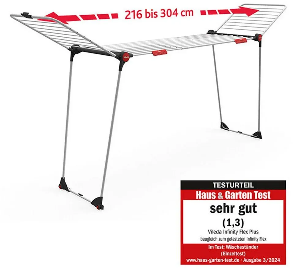Kategorie: Wäscheständer - Vileda - GTIN:4023103232419 - Flexibel ausziehbarer Wäscheständer: von 216 cm bis 304 cm Gesamtlänge (Mittelteil: 117-205cm) Platz für bis zu drei Waschmaschinenfüllungen Parallele Standbeine aus robustem Stahl und starke Gelenke sorgen für einen stabilen Stand Ideal für das Trocknen großer Wäschestücke TüV GS geprüft, - 67,89 Euro bei Amazon Marketplace Home - gefunden von billiger.de Dieser weiÃ?e Wäscheständer für 72.93 Euro ist eine klassische und beliebte Wahl. ![]() ![]() Vileda Infinity Flex, Wäscheständer, Weiss