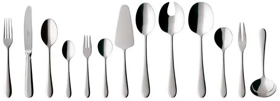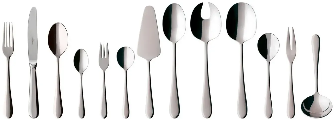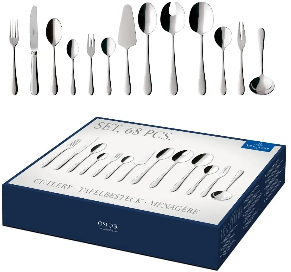 23 Händlerangebote bei billiger.de - Kategorie: Besteck-Sets - Villeroy & Boch - Villeroy & Boch Besteck-Serie Oscar aus rostfreiem, spülmaschinenfestem Edelstahl 18/10.Villeroy & Boch setzt mit dem Tafelbesteck der Kollektion Oscar klassisch-edle Akzente - ein Genuss für alle Sinne. Die Besteck-Kollektion Oscar von Villeroy & Boch verbindet klassische Eleganz gekonnt mit einer modernen Formensprache.Die dezente Prägung am Messergriff passt zu festlichen Anlässen und eignet sich als Grundausstattung für den täglichen Gebrauch. Spülmaschinenfest.Die Besteck-Serie Oscar ist in folgenden Ausführungen lieferbar: 24-teilig: je 6 Messer, Gabeln, Löffel, Kaffeelöffel. 30-teilig: 24-teilig + 6 Kuchengabeln. 68-teilig: je 12 Messer, Gabeln, Löffel, Kaffeelöffel, Kuchengabeln, je 1 Zuckerlöffel, Tortenheber, Gemüselöffel, Salatgabel, Salatlöffel, Suppentassen-/Sahnelöffel, Fleischgabel, Saucenlöffel. - GTIN:4003686326118 ![]() ![]() Villeroy & - Boch Oscar eBay Besteckset 68-tlg. für 12 Personen, Edelstahl