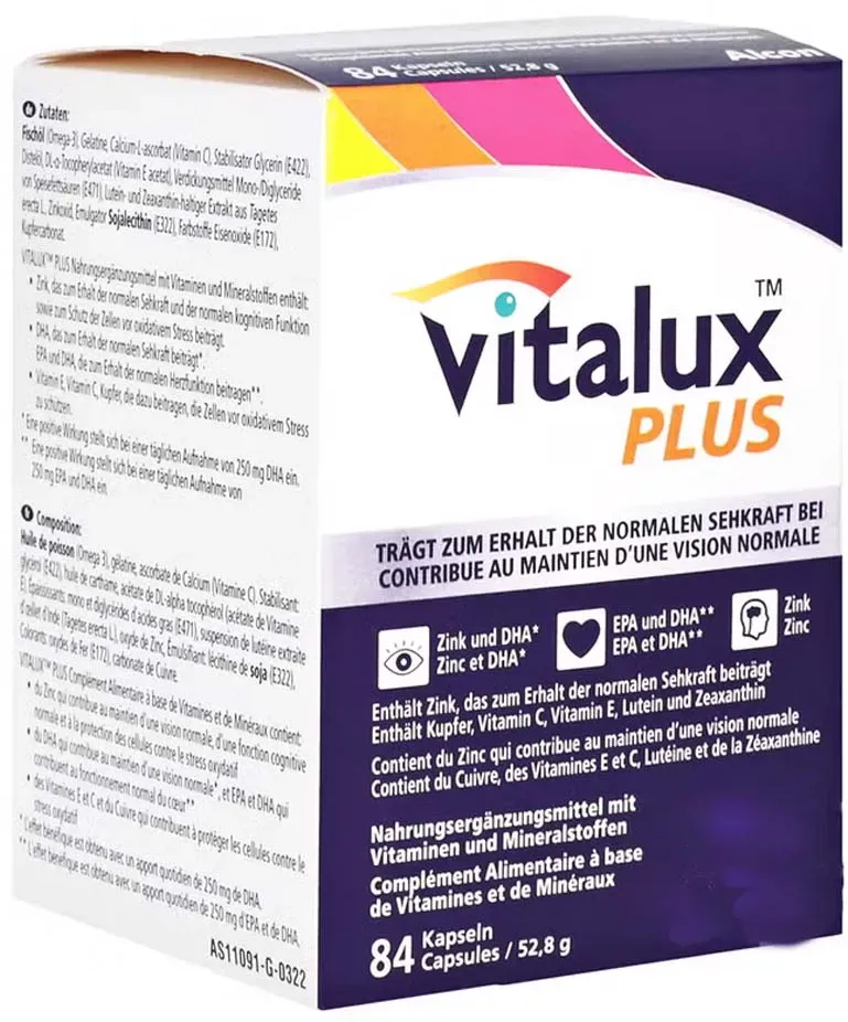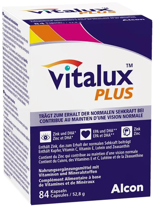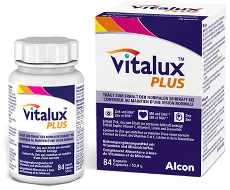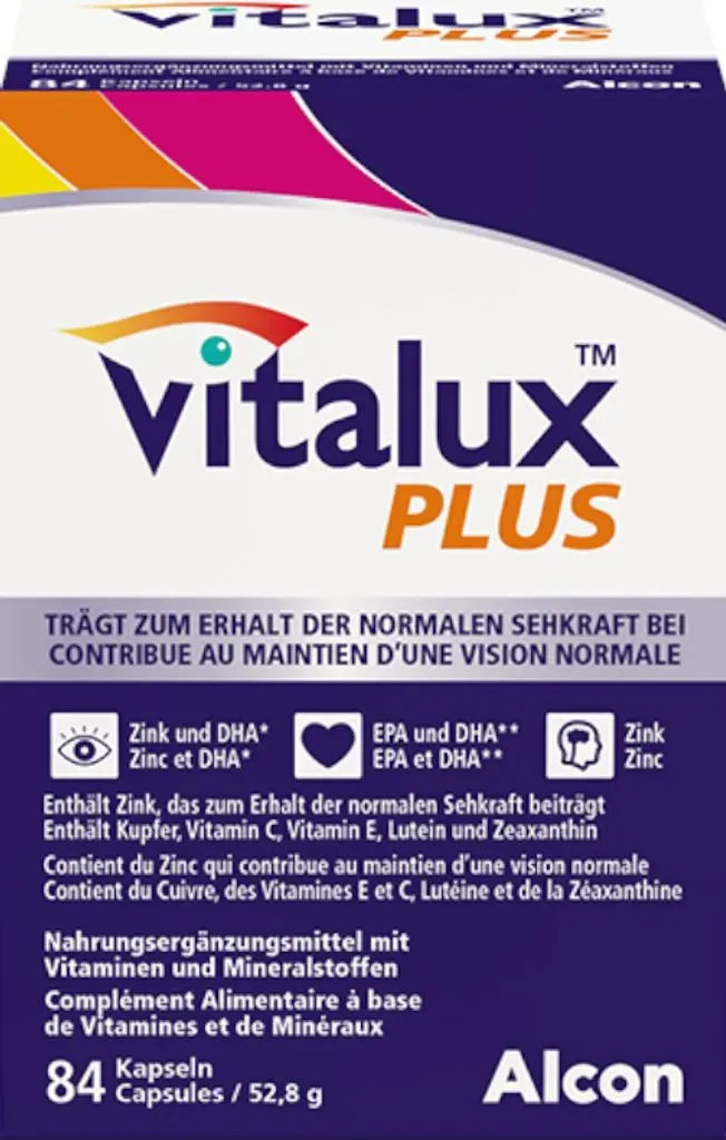 Vitalux plus 84 META PreisvergleichMit dem Meta-Preisvergleich suchen Sie gleichzeitig bei den großen Preisvergleich Portalen!Jetzt live Suche nach vitalux plus 84 starten! Vitalux plus 84 KaufberatungVitalux Plus 84 ist ein Nahrungsergänzungsmittel, das speziell zur Unterstützung der Augengesundheit entwickelt wurde, insbesondere zur diätetischen Behandlung der altersbedingten Makuladegeneration (AMD). Es enthält eine Kombination aus Omega-3-Fettsäuren (DHA und EPA), den Antioxidantien Vitamin C und E, den Carotinoiden Lutein und Zeaxanthin sowie den Spurenelementen Zink und Kupfer[2][3][5][6]. Wichtig bei der Anwendung ist: