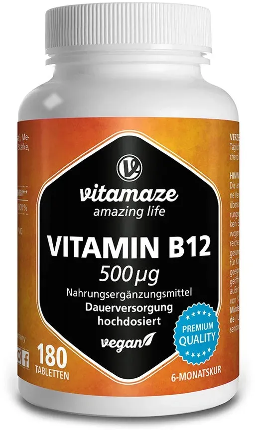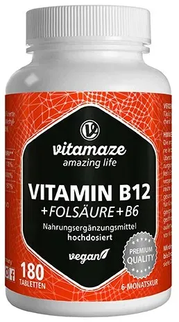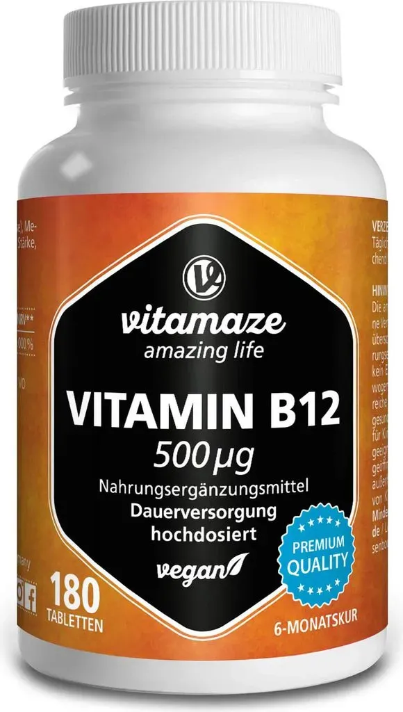 Kategorie: Nahrungsergänzungsmittel - Vitamaze - GTIN:4260435489603 - IDEAL KOMBINIERT: Unser hochdosiertes Vitamin B12 mit 500 mcg pro Tablette ist als VITAL-Formel zusätzlich mit den lebenswichtigen Vitaminen B6 und B9 (Folsäure) angereichert. Unser Vitamin B12 wird aus hochwertigem Methylcobalamin hergestellt und hat daher die beste und schnellste Bioverfügbarkeit. VEGAN: Das Produkt wird ausschließlich aus nicht-tierischen Zutaten hergestellt und ist daher ideal für VEGAN und VEGETARIAN Unser Produkt ist frei von gentechnisch veränderten Zutaten und unnötigen Zusatzstoffen. BESTE BIOVERFüGBARKEIT: Ohne den umstrittenen Zusatzstoff Magnesiumstearat (Magnesiumsalze von Fettsäuren) für die OPTIMALE AUFNAHME DER AKTIVSTOFFE. Viele andere Hersteller verwenden Magnesiumstearat in ihren Produkten. DEUTSCHES QUALITäTSPRODUKT: Wir produzieren ausschließlich in Deutschland. Unsere Produktion basiert auf dem HACCP-Konzept. Bei der Entwicklung und Herstellung unserer Produkte arbeiten wir eng mit Wissenschaftlern und Experten zusammen. ZUFRIEDENHEITS Zufriedene Kunden sind uns wichtig, bitte kontaktieren Sie uns, wenn Sie irgendwelche Fragen zu unseren Produkten haben. Kaufen Sie noch heute OHNE RISIKO zum besten Preis-Leistungs-Verhältnis auf dem Markt, wir bieten 30 Tage kostenloses Rückgaberecht. - 12,95 Euro bei Amazon Marketplace Health & Personal Care - gefunden von billiger.de Mit 13,94 Euro für 180 Tabletten mit 500 µg B12 ist dies ein sehr preiswertes Angebot für eine mittlere Dosierung. ![]() ![]()