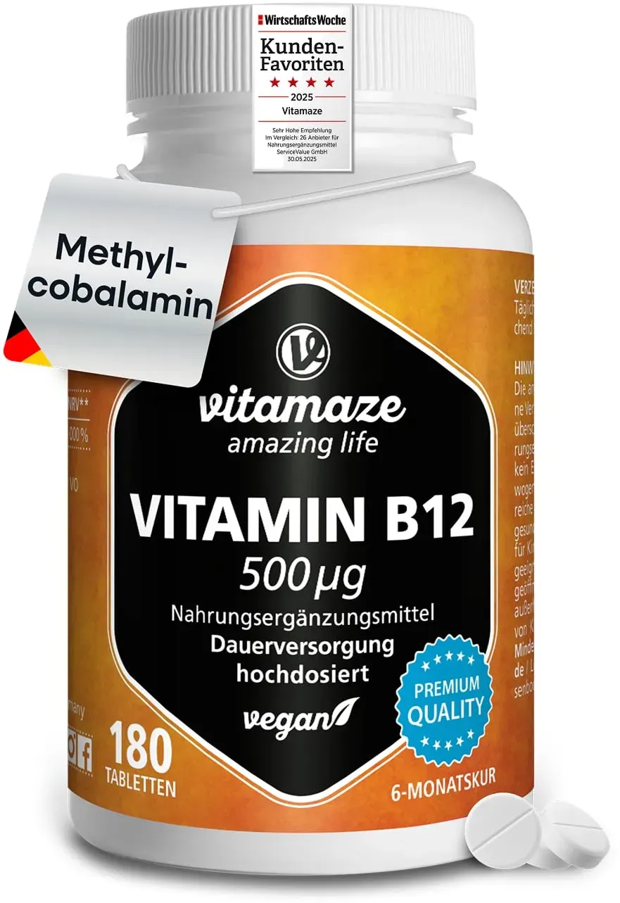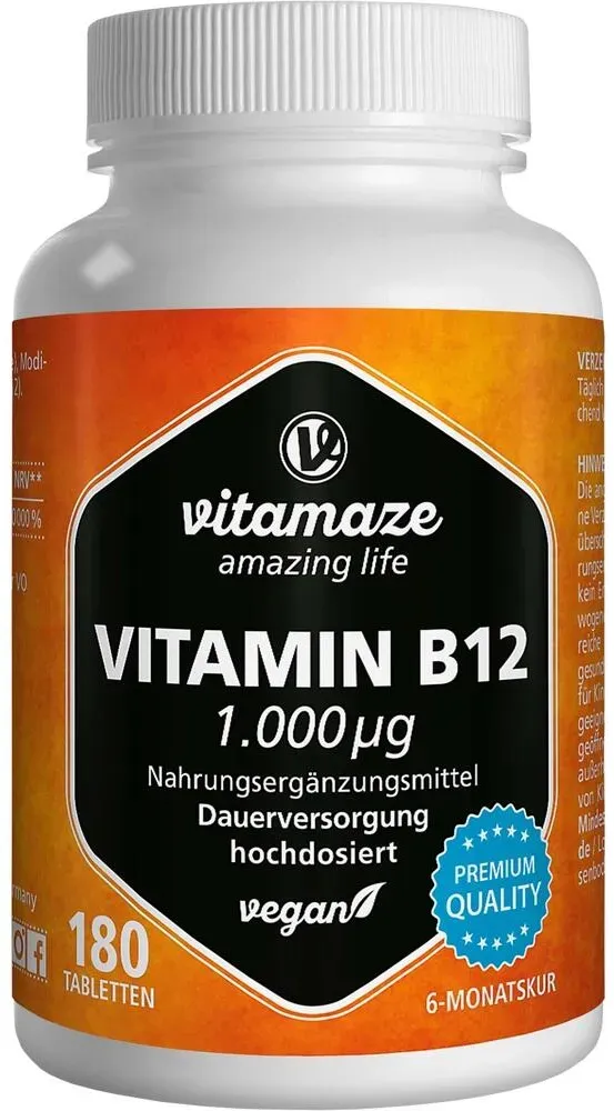 Zusammengefasst sollten Sie beim Kauf auf die hochdosierte Methylcobalamin-Form, vegane Herstellung, Packungsgröße und gute Kundenbewertungen achten. Der Preis liegt je nach Packungsgröße meist zwischen ca. 19 und 25 Euro für 180 bis 360 Tabletten. Für eine langfristige Versorgung sind größere Packungen oft wirtschaftlicher. Hier können Sie direkt suchen und Preise vergleichen: Vitamaze Vitamin B12 1000 µg 360 Tabletten Vitamaze Vitamin B12 1000 µg 180 Tabletten Vitamaze Vitamin B12 1000 µg 90 Tabletten Jetzt live Suche nach vitamaze vitamin b 12 starten! Empfohlene Vitamaze vitamin b 12 Angebote*Durch Käufe über Links zu Händlern kann diese Website eine Provision erhalten, u.a. durch das eBay Partner Network und das AmazonPartnerNetDieses Angebot ist mit 11,90 Euro das günstigste für 180 Tabletten mit 500 µg B12 und bietet somit ein hervorragendes Preis-Leistungs-Verhältnis. ![]() ![]() Vitamaze Vitamin B12 500 g Tabletten 180 St.