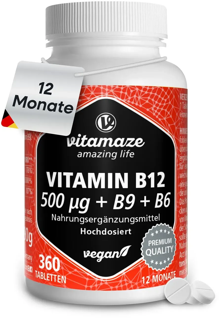 Auf Lager Versand durch AmazonVitamin B12 500 mcg hochdosiert, 360 Tabletten für 1 Jahr mit 375 mcg Vitamin B9 Folsäure + Vitamin B6, Natürliche Nahrungsergänzung ohne Zusatzstoffe, Made in Germany