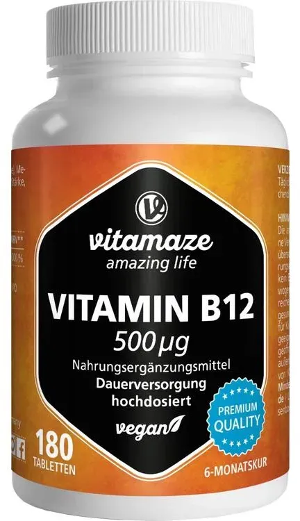 Zusammengefasst: Vitamaze Vitamin B12 ist eine hochwertige, vegane und gut verträgliche Option - besonders die 1.000-µg-Variante in der Großpackung bietet ein sehr gutes Preis-Leistungs-Verhältnis. Vergleichen Sie immer die aktuellen Preise und achten Sie auf die für Sie passende Dosierung. Jetzt live Suche nach vitamaze vitamin b12 starten! Empfohlene Vitamaze vitamin b12 Angebote*Durch Käufe über Links zu Händlern kann diese Website eine Provision erhalten, u.a. durch das eBay Partner Network und das AmazonPartnerNetDieses Angebot ist mit 11.90 Euro eine der günstigsten Optionen für 180 Tabletten mit 500 µg B12. ![]() ![]() Vitamaze Vitamin B12 500 g Tabletten 180 St.