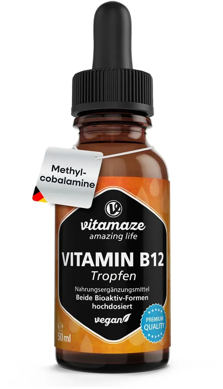 Kategorie: Nahrungsergänzungsmittel - Vitamaze - GTIN:4260435489122 - HOCHDOSIERT: 50 ml = 1700 vegane Tropfen mit je 100 g Vitamin B12 in den bioaktivsten Formen Methylcobalamin und Adenosylcobalamin (im Verhältnis 80:20). Vitamin B12 ist essentiell für viele Körperfunktionen und trägt außerdem zur Verringerung von Müdigkeit bei. Für Veganer und Vegetarier geeignet. DOSIERUNG: Mit praktischer Pipette mit Naturkautschuk (BPA-frei) in lichtgeschützter Glasflasche zur einfachen Dosierung. Sie können sich das Produkt direkt auf die Zunge tropfen oder das vegane und natürlich rot gefärbte Vitamin B12 Ihrer Nahrung hinzufügen. BESTE BIOVERFüGBARKEIT: Ohne den umstritten Zusatzstoff Magnesiumstearat (Magnesiumsalze der Speisefettsäuren) zur OPTIMALEN WIRKSTOFFAUFNAHME. Viele andere Hersteller verwenden Magnesiumstearat als Trennmittel bei der Herstellung. DEUTSCHES QUALITäTSPRODUKT: Wir produzieren nur in Deutschland. Unsere Produktion richtet sich nach dem HACCP-Konzept. Bei der Entwicklung und Herstellung unserer Produkte arbeiten wir eng mit Wissenschaftlern und Experten zusammen. ZUFRIEDENHEITS Zufriedene Kunden sind uns wichtig, kontaktieren Sie uns gerne bei Fragen zu unseren Produkten. Wir sind für Sie da. Kaufen Sie noch heute OHNE RISIKO zum besten Preis-Leistungsverhältnis auf dem Markt, wir bieten Ihnen 30 Tage kostenfreies Rückgaberecht. - 15,97 Euro bei Amazon Marketplace Health & Personal Care - gefunden von billiger.de Dieses Angebot von Juvalis.de ist eine preisgünstige Option für hochdosiertes, veganes B12 mit zusätzlichen B9 und B6. Juvalis.de Vitamaze Vispura VITAMIN B12 1.000 μg hochdos.+B9+B6 vegan