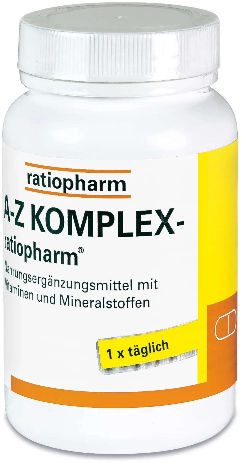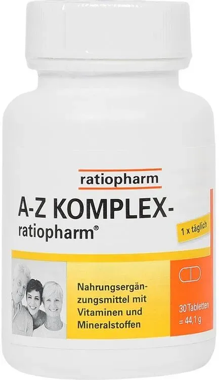 25 Händlerangebote bei billiger.de - Kategorie: Nahrungsergänzungsmittel - Ratiopharm - Anwendungsgebiet von A-Z Komplex ratiopharm TablettenA-Z Komplex ratiopharm Tabletten sichert Ihnen die ausreichende Versorgung mit Vitalstoffen. Ergänzend zur täglichen Ernährung versorgt Sie A-Z Komplex ratiopharm Tabletten bequem mit vielen wichtigen Vitaminen, Mineralstoffen Spurenelementen und Mineralstoffen. Wirkstoffe / Inhaltsstoffe / ZutatenInhaltsstoffe von A-Z Komplex ratiopharm Tabletten: Pro Tablette: Vitamin A 800,00 g RE, Vitamin B1 1,10 mg, Vitamin B2 1,40 mg, Vitamin B6 1,40 mg, Vitamin B12 2,50 g, Biotin 50 g, Folsäure 200,00 g, Niacin 16,00 mg NE, Pantothensäure 6,00 mg, Vitamin C 80,00 mg, Vitamin D3 5,00 g, Vitamin E 12,00 mg TE, Vitamin K1 75,00 g, Calcium 162,00 mg, Kalium 40,00 mg, Magnesium 125,00 mg, Chlorid 36,00 mg, Phosphor 125,00 mg, Chrom 20,00 g, Eisen 5,00 mg, Jod 100,00 g, Kupfer 0,50 mg, Molybdän 25,00 g, Selen 25,00 g, Zink 5,00 mg. 1 Tablette entspricht 0,01BE Zutaten von A-Z Komplex ratiopharm Tabletten: Calciumphosphat, Magnesiumoxid, L-Ascorbinsäure (Vitamin C), Kaliumchlorid, Feuchthaltemittel Sorbit, überzugsmittel Hydroxypropylmethylcellulose, Füllstoff mikrokristalline Cellulose, DL- -Tocopherylacetat (Vitamin E), Nicotinamid (Niacin), Eisenfumarat, Trennmittel Magnesiumsalze von Speisefettsäuren, Trennmittel Polyvinylpyrrolidon, Farbstoff Titandioxid, Calcium-D-Pantothenat (Panthotensäure), Zinkoxid, Kupfergluconat, Kartoffelstärke, ... Dieses Angebot ist ideal für den Einstieg, da es eine kleine PackungsgröÃ?e zu einem günstigen Preis bietet, um das Produkt kennenzulernen. ![]() ![]() Vitamin B-Komplex ratiopharm direkt - mit 8 B-Vitaminen 20 St