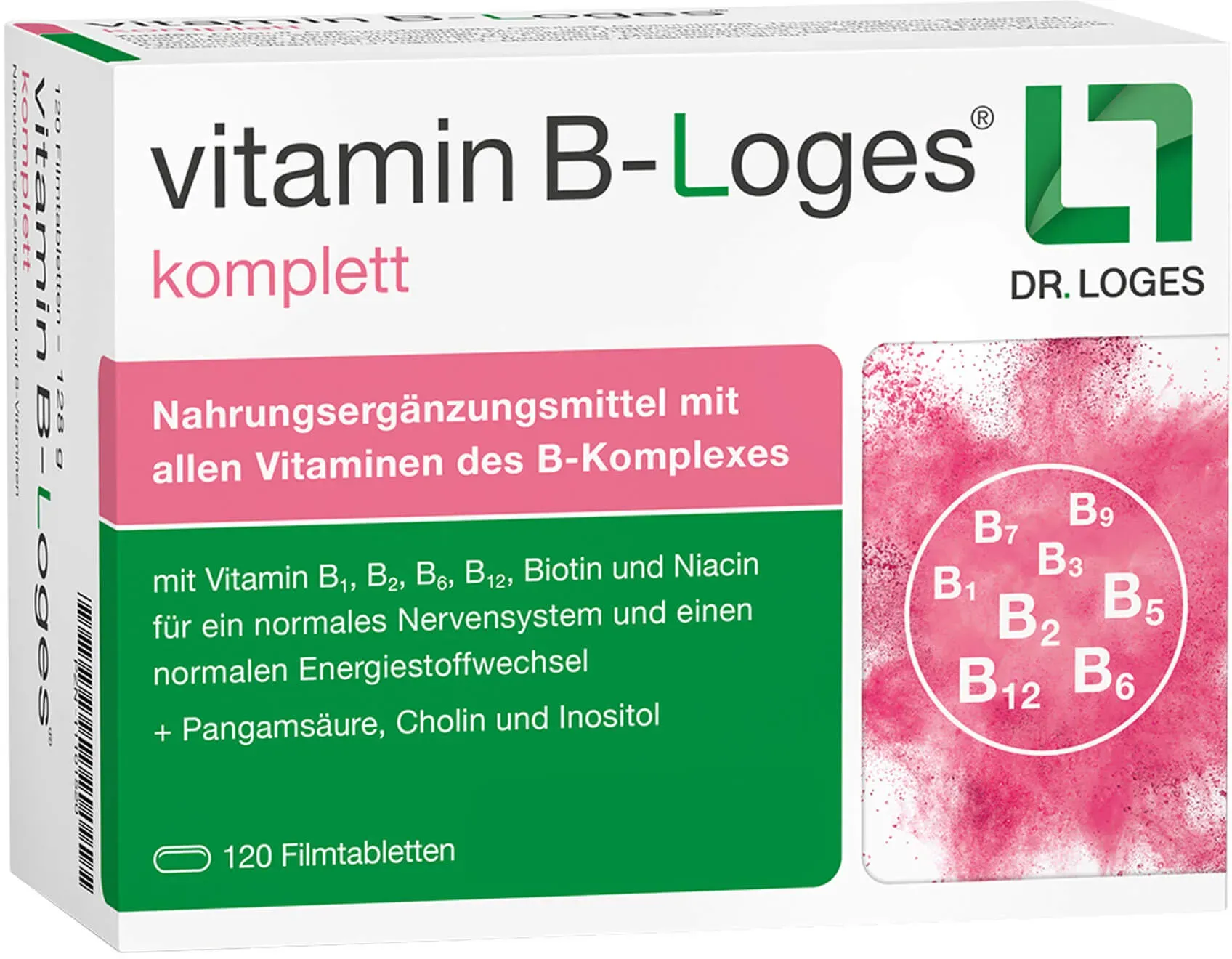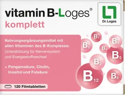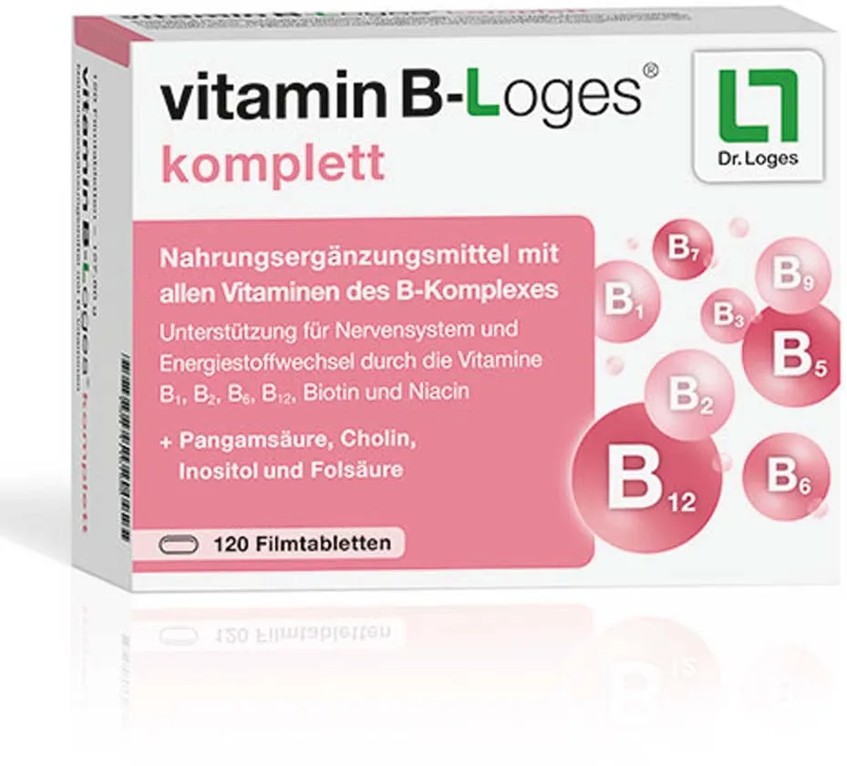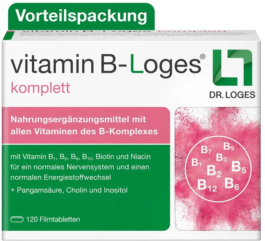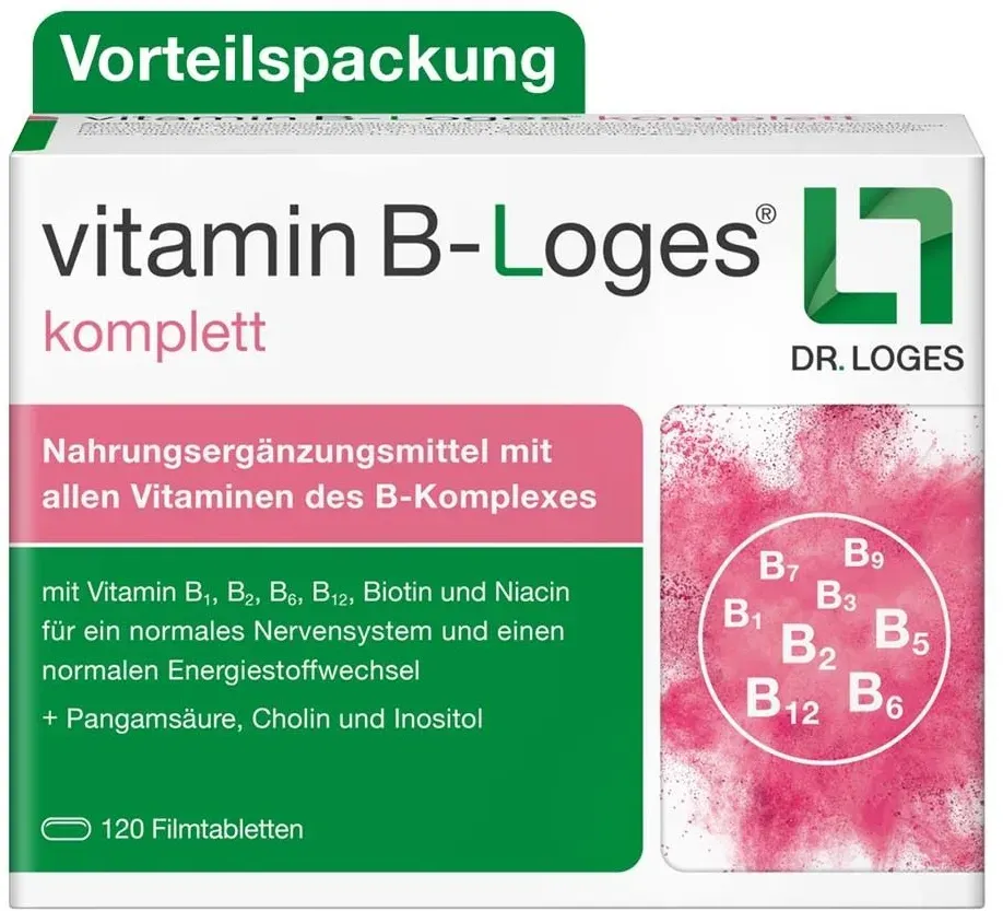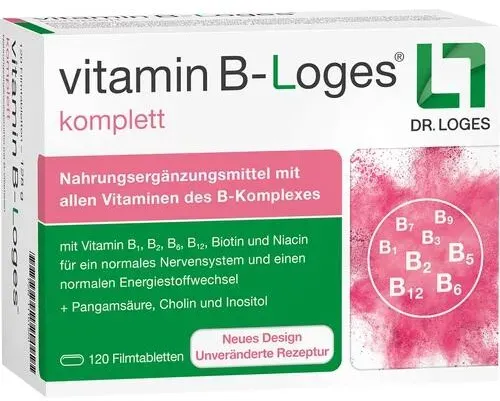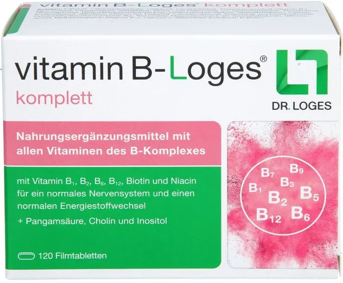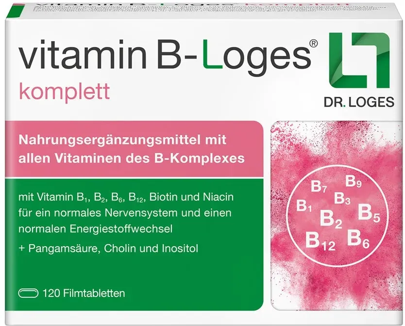 Kategorie: Nahrungsergänzungsmittel - Dr. Loges - GTIN:4260663910542 - PZN:11101520 - Nahrungsergänzungsmittel sind kein Ersatz für eine ausgewogene, abwechslungsreiche Ernährung und gesunde Lebensweise. Wirkstoffe: Thiamin nitrat Riboflavin Nicotinamid Calcium pantothenat ... - 29,29 Euro bei Mycare - gefunden von billiger.de Preisapo bietet die 120er Packung zu einem runden Preis von 30 Euro an, was eine gute Option darstellt. ![]() ![]() Dr. Loges VITAMIN B-LOGES komplett Filmtabletten 120 St