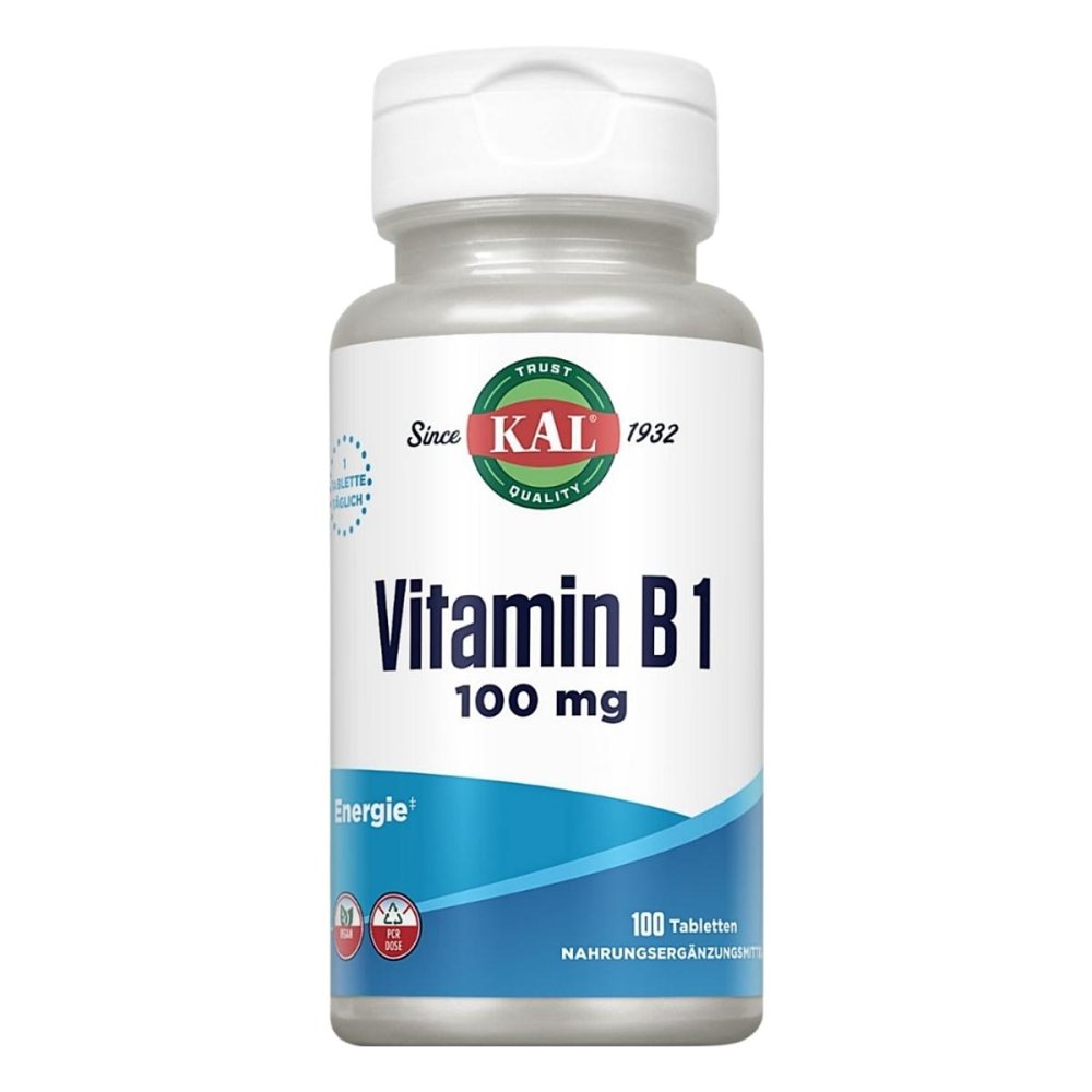 EAN: 4335854160119 - Anwendungsgebiet von KAL Vitamin B1 Thiamin 100 mg Tabletten Vitamin B1 100 mg vegan laborgeprüft von KAL: Thiamin für Energiestoffwechsel, Nerven und Herz Die essenzielle Rolle von Vitamin B1 (Thiamin) Vitamin B1, auch bekannt als Thiamin, ist ein wasserlösliches Vitamin aus der B-Komplex-Familie. Es trägt zu einem normalen Energiestoffwechsel bei und unterstützt die normale Funktion des Nervensystems sowie eine normale Herzfunktion. Da der menschliche Körper Thiamin nicht in relevanten Mengen speichern kann, ist eine regelmäßige Zufuhr über die Ernährung oder durch hochwertige Nahrungsergänzungsmittel wie das Vitamin B1 100 mg vegan laborgeprüft von KAL sinnvoll. Wissenschaftlich fundierte Vorteile von Vitamin B1 (Thiamin) Die Wirkung von Vitamin B1 für den menschlichen Organismus ist wissenschaftlich belegt. Thiamin ist ein Cofaktor für Enzyme, die am Kohlenhydratstoffwechsel beteiligt sind, und trägt zur normalen Energiegewinnung aus Nährstoffen bei. Trägt zu einem normalen Energiestoffwechsel bei Trägt zu einer normalen Funktion des Nervensystems bei Trägt zu einer normalen Herzfunktion bei Eine ausreichende Versorgung mit Vitamin B1 ist für alle Menschen wichtig, die ihre normale körperliche und geistige Funktion unterstützen möchten. Besondere Merkmale von Vitamin B1 100 mg vegan laborgeprüft von KAL Das Vitamin B1 100 mg von KAL zeichnet sich durch eine hohe Dosierung und geprüfte Qualität aus. Jede Tablette liefert 100 mg reines Thiamin. Die ... Für 7.77 Euro erhalten Sie 100 Tabletten mit 100 mg Thiamin, was eine solide Option im mittleren Preissegment darstellt. Medikament e- per- klick.de VITAMIN B1 THIAMIN 100 mg KAL Tabletten 100 St
