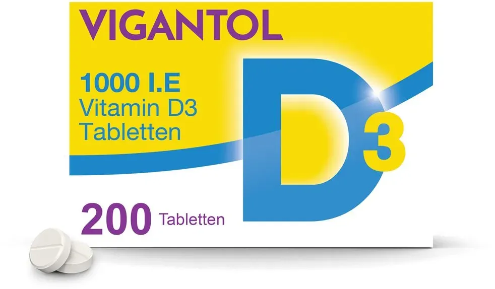 0,05 /Stück - Kategorie: Nahrungsergänzungsmittel - VIGANTOL - GTIN:4150131556900 - PZN:13155690 - VIGANTOL 1000 I.E. Ihr Partner zur Vorbeugung gegen Vitamin-D-Mangel! Warum Vitamin D? VIGANTOL 1000 I.E. wird zur Prävention von Vitamin-D-Mangel sowie zur unterstützenden Behandlung von Osteoporose und zur Rachitisprophylaxe angewendet. Einfache Einnahme Mit VIGANTOL 1000 I.E. haben Sie eine praktische Lösung zur Hand. Bereits eine halbe Tablette VIGANTOL 1000 I.E. dauerhaft und täglich eingenommen, reicht in den meisten Fällen aus, einem Vitamin-D-Mangel vorzubeugen. Die kleinen, leicht schluckbaren Tabletten können bei Bedarf auch in Wasser auf einem Teelöffel aufgelöst werden. Vertrauen Sie dem Marktführer für Vitamin D Produkte1. 1 Nicht-verschreibungspflichtige Vitamin D-Produkte in Apotheken. Insight Health; DatamedIQ, Stand: 12/2024 Bezeichnung: VIGANTOL 500 I.E./1000 I.E. Vitamin D3 Tabletten. Wirkstoff: Colecalciferol. Anwendungsgebiete: Zur Vorbeugung gegen Rachitis (Verkalkungsstörungen des Skeletts im Wachstumsalter, auch bei Frühgeborenen) und Osteomalazie (Knochenerweichung bei Erwachsenen). Zur Vorbeugung bei erkennbarem Risiko einer Vitamin-D Mangelerkrankung bei ansonsten Gesunden ohne Resorptionsstörung (Störung der Aufnahme von Vitamin D im Darm) bei Kindern und Erwachsenen. Zur unterstützenden Behandlung der Osteoporose (Abbau des Knochengewebes) bei Erwachsenen. Warnhinweise: enthält Sucrose(Zucker). Packungsbeilage beachten. Stand: Juli 2023 Zu Risiken ... VIGANTOL 1.000 I.E. Vitamin D3 Tabletten für 10.48 Euro sind ein Klassiker und eine zuverlässige Wahl. ![]() ![]() Vitamin D3 1000 I.E. VIGANTOL Tabletten 200 St