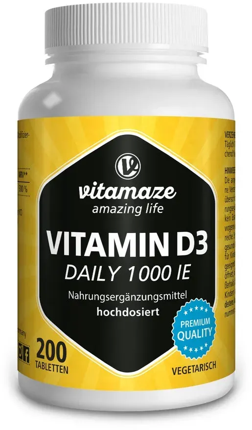 0,03 / 1 st - Kategorie: Arzneimittel - Additiva - GTIN:4150107148061 - PZN:10714806 - ADDITIVA Osteogard Mono D3 800 i.E Vitamin D3 trägt zur Erhaltung normaler Knochen und einer normalen Muskelfunktion bei. Verzehrempfehlung 1 Tablette täglich mit etwas Wasser einnehmen. Die angegebene empfohlene tägliche Verzehrmenge darf nicht überschritten werden. Kann bei übermäßigem Verzehr abführend wirken. Nahrungsergänzungsmittel sind kein Ersatz für eine ausgewogene und abwechslungsreiche Ernährung und eine gesunde Lebensweise. Außer Reichweite von kleinen Kindern lagern. Nicht für Kinder und Jugendliche unter 1 n geeignet. Nährwertangaben Eine Tablette (0,06 g) enthält: Vitamin D3 20 g ? 800 I.E. 400 % NRV* *NRV = Nährstoffbezugswerte Zutaten Füllstoff Isomalt, Trennmittel Magnesiumsalze der Speisefettsäuren, Vitamin D3. - 6,39 Euro bei Apotal - gefunden von billiger.de Vitamaze bietet hier eine vegetarische Option mit 1000 I.E. Vitamin D3 für 7.40 Euro, was für Vegetarier besonders empfehlenswert ist. ![]() ![]() Vitamaze VITAMIN D3 1.000 I.E. daily vegetarisch 200 St