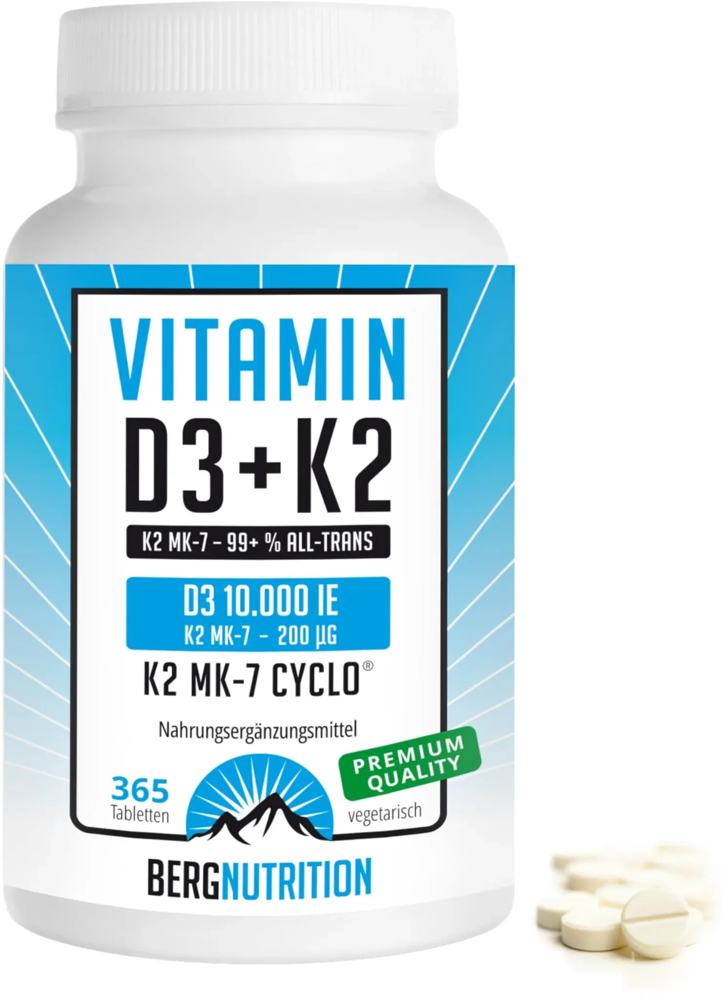 Kategorie: Nahrungsergänzungsmittel - Berg Nutrition - GTIN:4260329841784 - SEHR HOHE BIOVERFüGBARKEIT: Wir verwenden Vitamin D3 (Cholecalciferol) aus Lanolin, mit 10.000 I.E - 250 g Vitamin D3 und Vitamin K2 MK7 - 99+% ALL-Trans Menaquion mit 200 g / mcg Vitamin K2 HOCHDOSIERT UND 100% VEGETARISCH: Jeden 10. Tag 1 Tablette mit einem Glas Wasser zu sich nehmen. Dies entspricht einer täglichen Verzehrmenge von 25 g (1000 I.E., 500% NRV). Die empfohlene Verzehrmenge darf nicht überschritten werden TABLETTENHERSTELLUNG IN DEUTSCHLAND: Unsere hochdosierten Vitamin D3 + K2 Tabletten werden in einer der modernsten Produktionsanlagen Europas direkt in Deutschland hergestellt und bieten so beste Qualität. Sollten Sie wider Erwarten einmal nicht zufrieden sein, kontaktieren Sie uns gerne. FREI VON UNERWüNSCHTEN ZUSATZSTOFFEN: Dieses Produkt ist rt frei von Allergenen, Magnesiumstearat, Titandioxid, Carrageen und Polyethylenglykol (PEG) sowie von Aromen, Farb- und Süßungsmitteln. Selbstverständlich sind alle Inhaltsstoffe auf Schwermetalle und Pestizide geprüft. Wir verwenden laut Gesetzgeber auch keine Rohstoffe, die gentechnisch verändert (GMO), bestrahlt oder mit Ethylenoxid behandelt wurden. Die Tablett sind damit gelatinefrei - laktosefrei - glutenfrei. TEILBAR UND EINFACH ZU SCHLUCKEN: Für eine sorglose Einnahme bieten wir Ihnen eine praktische Familienpackung mit 365 kleinen, leicht schluck- und teilbaren Vitamin D3 K2 Tabletten I Vitamin D3 und K2 für Alle - 22,95 Euro bei ... Dieses umfassende Produkt für 69,90 Euro enthält neben Vitamin D3 weitere Inhaltsstoffe wie Tribulus Terrestris und Ashwagandha, die synergistische Effekte bieten können. ![]() Testobooster Vitastrong Tribulus Terrestris, Ashwagandha KSM-66, Zink-Becglycinat, Vitamin D3, Eisen- und Folsäure, Text-Booster 90 Tabletten Vegan mit Vitamin D für normale Muskelfunktion