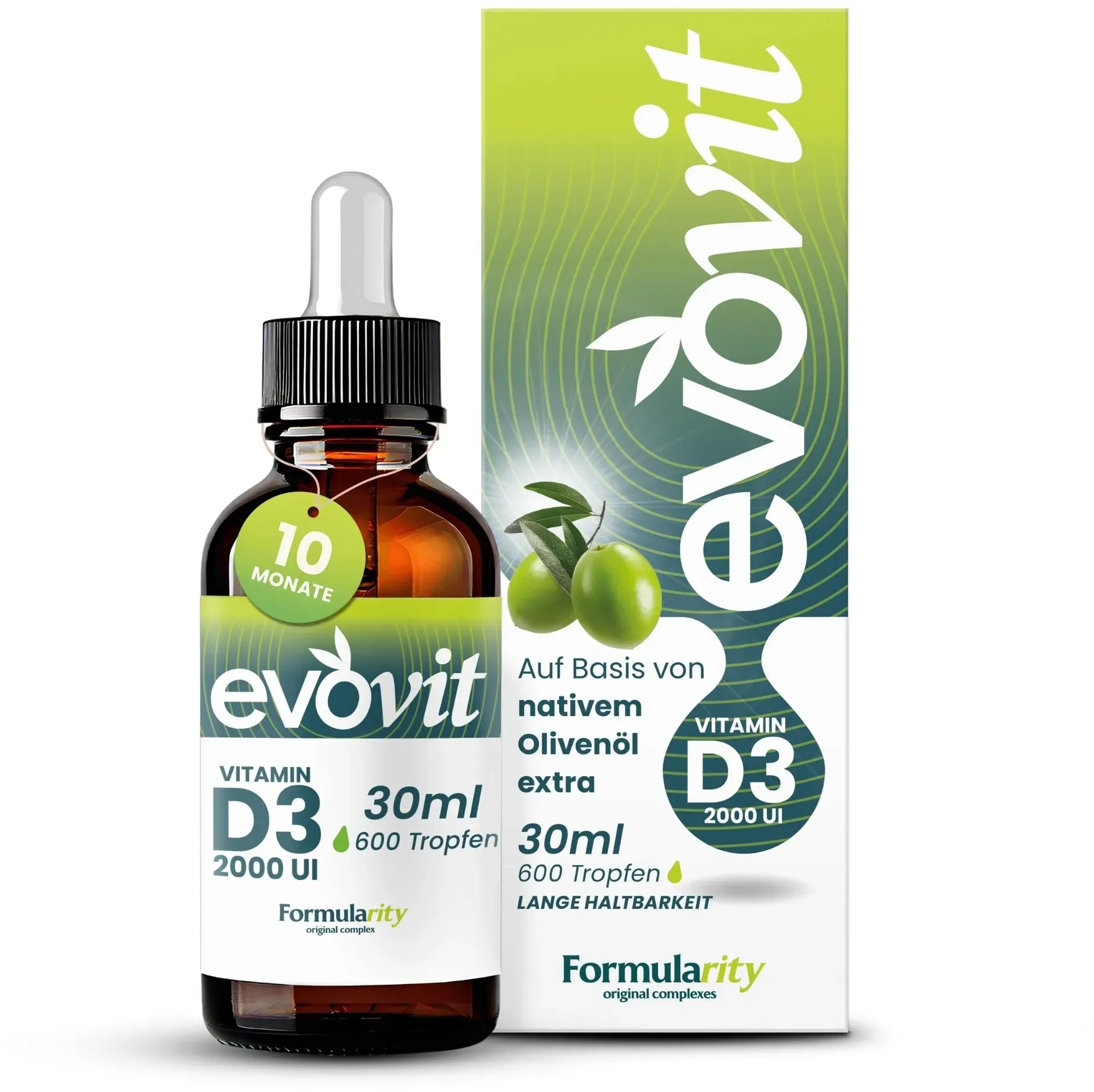 Verfügbarkeit: Auf Lager - Kategorie: Nahrungsergänzungsmittel - formularity - GTIN:8056214741033 - DIE VORTEILE VON VITAMIN D3 - Vitamin D3 trägt zur normalen Muskelfunktion und zum normalen Funktionieren des Immunsystems bei, indem es in den Prozess der Zellteilung eingreift. Es spielt eine Schlüsselrolle bei der Aufnahme von Kalzium und Phosphor und trägt so zur Erhaltung gesunder Knochen und Zähne bei. EXTRA-VIRGIN OLIVENöL - Unser Vitamin D3 wird in italienischem nativem Olivenöl extra stabilisiert, um eine hohe Bioverfügbarkeit und Absorption zu gewährleisten. Kaltgepresstes EVO-Olivenöl ist für seine ernährungsphysiologischen Eigenschaften und seine positiven Auswirkungen auf die Gesundheit bekannt, da es einen hohen Gehalt an ölsäure, Phenolen, Tocopherolen und Phytosterolen aufweist, die natürliche entzündungshemmende und antioxidative Eigenschaften haben. QUALITäT UND BEQUEMLICHKEIT - 2 Tropfen Evovit D3 liefern 50 μg (2000 I.E.) Vitamin D3 (Cholecalciferol), die Tagesdosis an D3 für Ihren Körper Ihre tägliche Vitamin-D3-Zufuhr ist mit dem praktischen integrierten Tropfer leicht zu dosieren. Eine einzige Flasche rt Ihnen eine wirksame Supplementierung für 10 Monate! ABSOLUTE SICHERHEIT - Wenn wir ein Produkt entwickeln, steht Ihre Gesundheit an erster Stelle. Deshalb fügen wir keine künstlichen Stoffe wie Aromen, Farbstoffe, schädliche Konservierungsmittel oder GVO hinzu. Die Evovit-Linie ist natürlich frei von Zucker, Gluten und ... Dieses Produkt kombiniert Vitamin D3 mit Vitamin K2, was für eine verbesserte Knochengesundheit vorteilhaft sein kann. ![]() ![]() Vita 4u Vitamin D3 + K2 - 2000 I.E. Vitamin D3 mit 100μg Vitamin K2 als All-Trans K2 MK7 - 180 vegetarische Tabletten