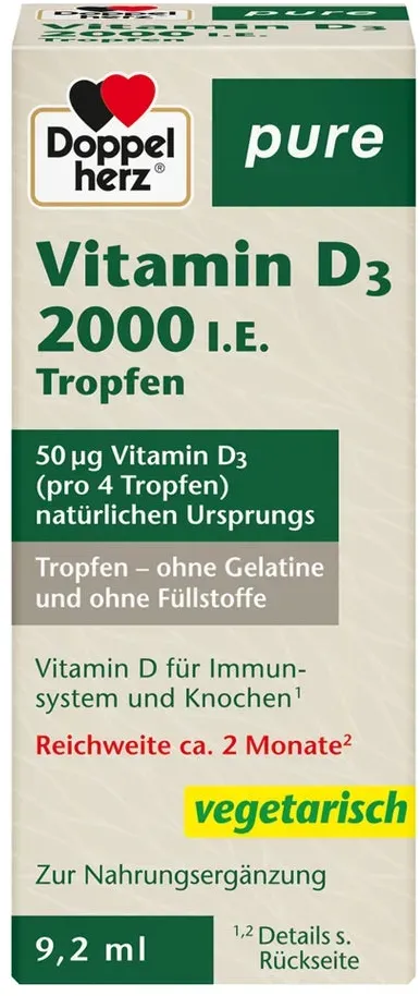 Verfügbarkeit: 1-2 Werktage - 0,05 €/St - Kategorie: Nahrungsergänzungsmittel - STADA - GTIN:4150175792869 - PZN:17579286 - Vitamin D3 STADA 2000 I.E. 60 St - rezeptfrei - von STADA Consumer Health Deutschland GmbH - Kapseln - 60 St - 2,72 Euro bei DocMorris Apotheke - gefunden von billiger.de Diese Tropfen sind eine gute Wahl für eine präzise und flexible Dosierung, besonders für Personen, die keine Tabletten schlucken möchten. ![]() ![]() Doppelherz pure Vitamin D3 2000 I.E. Tropfen 9,2 ml