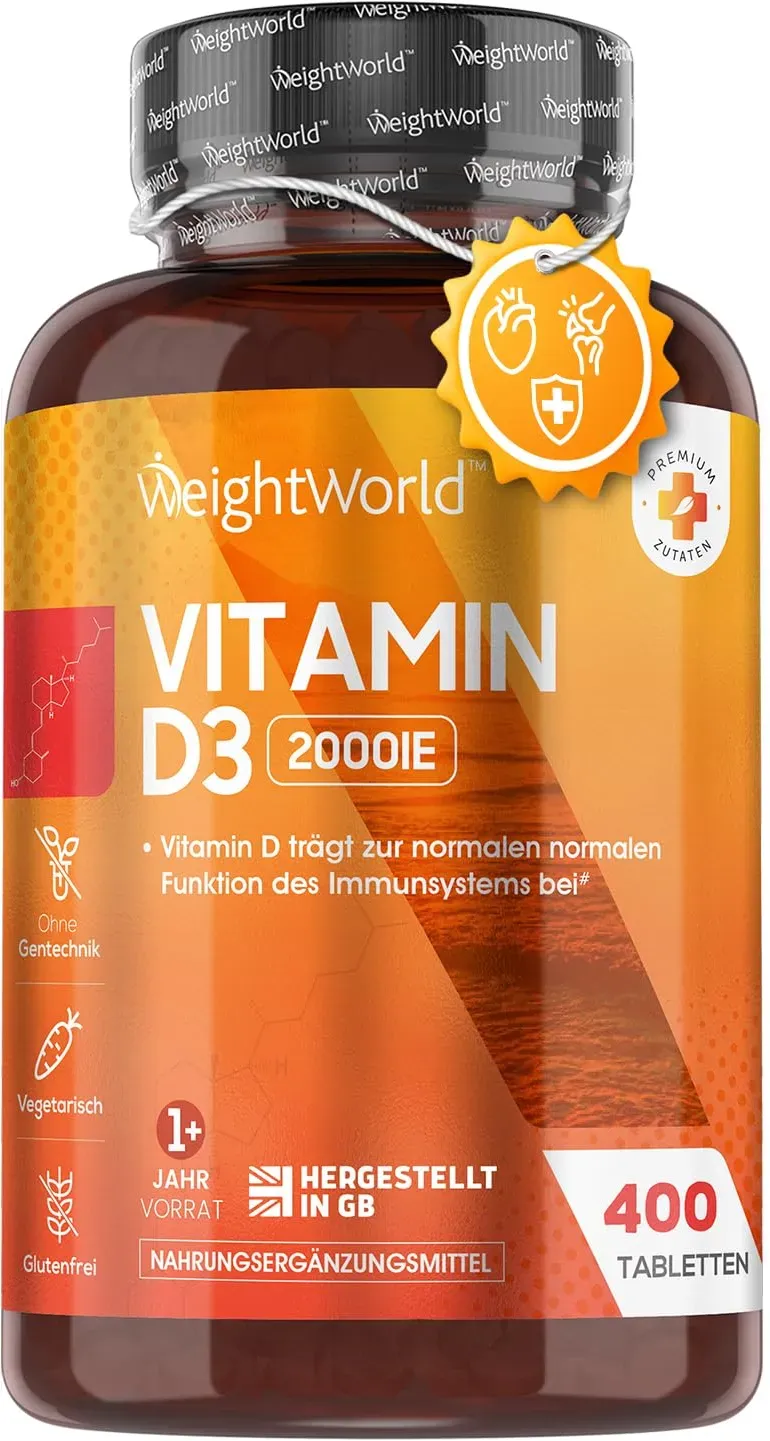 5 Händlerangebote bei billiger.de - Kategorie: Nahrungsergänzungsmittel - WeightWorld - Tägliche Dosis Vitamin D3 - Vitamin D ist auch als Sonnenvitamin bekannt. Jede Vitamin-D-Tablette enthält 2000 I.E. Cholecalciferol. Die empfohlene Tagesdosis beträgt in Deutschland 1000 I.E., so dass Sie alle 2 Tage 1 Tablette einnehmen müssen. Sie sind leicht zu schlucken. Mit 400 Tabletten pro Packung haben sie einen besonders langen Vorrat von mehr als n. Sonnenvitamin D - Laut EFSA trägt Vitamin D zur Verringerung des Sturzrisikos bei, das mit Haltungsinstabilität und Muskelschwäche einhergeht. Stürze sind ein Risikofaktor für Knochenbrüche bei Männern und Frauen im Alter von 6 n und älter. Es trägt auch zu einer normalen Aufnahme von Kalzium und Phosphor bei. Es trägt auch zu einer normalen Funktion des Immunsystems bei. Vitamin D spielt eine Rolle im Prozess der Zellteilung. Vitamin D3 Cholecalciferol - Laut EFSA trägt Vitamin D zur Erhaltung normaler Knochen, Muskelfunktionen und Zähne bei. Vitamin D wird vom Körper auf natürliche Weise als Reaktion auf das Sonnenlicht gebildet. - GTIN:5056128125922 Dieses vegane Produkt in Tablettenform bietet eine hohe Anzahl an Portionen für eine langfristige und kostengünstige Versorgung. ![]() ![]() Vitamin D3 2000 I.E. - 400 vegane Tabletten - 1 Tablette alle 2 Tage - Sonnenvitamin für Immunsystem, Knochen, Zähne & Muskeln (EFSA)- Vitamin D - Cholecalciferol von WeightWorld