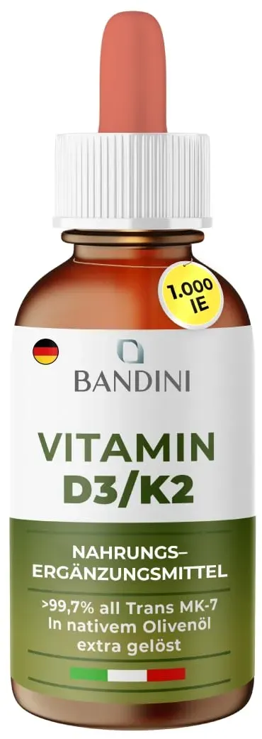 Zustand: Neu - 255,20 € / l - Vitamin D Vitamin D Präparate - WARNKE VITALSTOFFE - 23405 - EAN: 4251773400245 - Hervorragendes Preis-Leistungsverhältnis von Warnke Vitalstoffe: Vitamin K2-Tropfen aus eigener Herstellung. Vitalstoff-Kompetenz seit über 3 n! Die Tagesdosis von 10 Tropfen enthält 100 µg atürliches Menaquinon MK-7.Vitamin K trägt zu einer normalen Blutgerinnung und zur Erhaltung normaler Knochen bei. Zutaten: MCT-Öl (raffiniertes Palmkernöl), Vitamin K2 in Olivenöl (Öl; Olea europaea L.; enthält 4500ppm MK-7), Antioxidant D-alpha-Tocopherol, Zitronenöl Verzehrempfehlung: Erwachsene täglich 10 Tropfen entweder auf die Zunge geben oder direkt ins Essen tropfen. Inhalt: 50ml Vitamin K2 100mcg. Ergiebige Packung ohne Magnesiumstearat! Hochdosiert Qualität und Verbraucherfreundlichkeit: Unsere Produkte entsprechen den HACCP Qualitätsstandards. Hergestellt in Deutschland. Rohstoffe aus EU- und Nicht EU-Ländern. Die optimierte Verpackung mit einem versiegelten Dosierdeckel sorgt für die lange Haltbarkeit Ihrer Nahrungsergänzungsmittel und für ihre einfache Dosierung - 2 Händler im amazon.de Marketplace Diese Tropfen sind ideal für eine flexible Dosierung und enthalten hochwertiges Vitamin K2 in kaltgepresstem Olivenöl. ![]() ![]() Bandini Vitamin D3 K2 Tropfen Hochdosiert | Vitamin K2 99,7+% All-Trans MK-7 | 100 mcg K 2 + 1000 I.E hochbioverfügbares D 3 | In kaltgepresstem nativem Olivenöl Extra aus Italien | Laborgeprüft