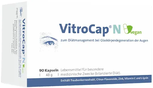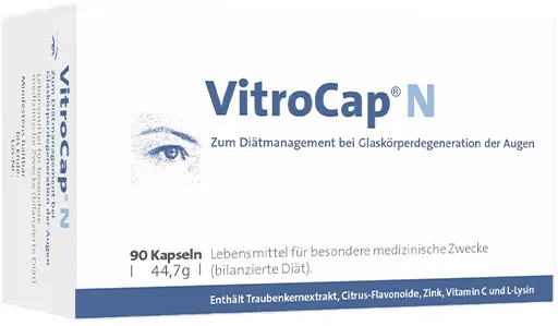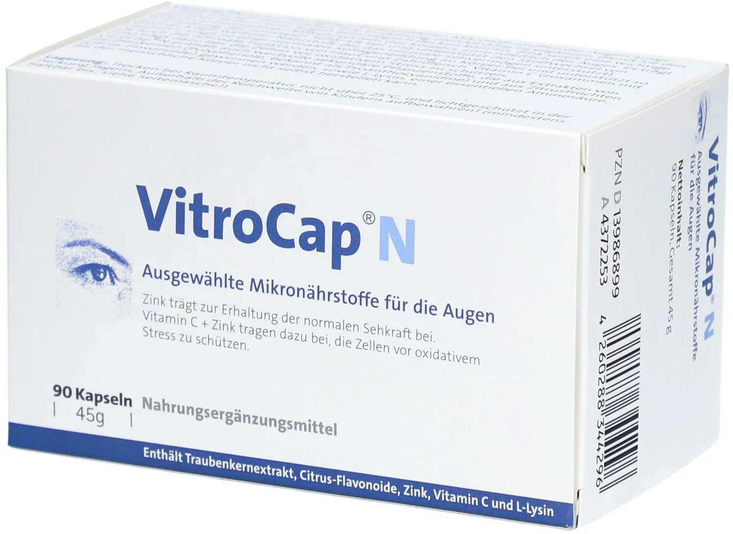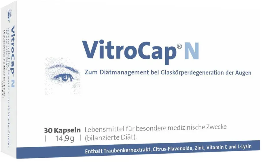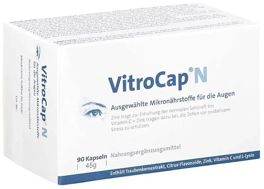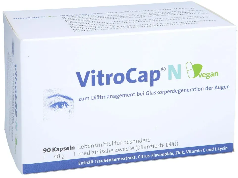 Vitrocap n kapseln 90 META PreisvergleichMit dem Meta-Preisvergleich suchen Sie gleichzeitig bei den großen Preisvergleich Portalen!Jetzt live Suche nach vitrocap n kapseln 90 starten! Vitrocap n kapseln 90 KaufberatungWas ist VitroCap®N und wofür wird es eingesetzt?VitroCap®N Kapseln sind ein diätetisches Lebensmittel für besondere medizinische Zwecke (bilanzierte Diät) zur diätetischen Behandlung von Glaskörperdegenerationen des Auges[6][8]. Sie enthalten eine Kombination aus Mikronährstoffen (z.?B. Zink, Vitamin C), Antioxidantien (Traubenkernextrakt, Zitrusfruchtextrakt) und der Aminosäure L-Lysin[5][7]. Die Kapseln sind glutenfrei, laktosefrei und vegan[5]. Sie werden vor allem bei subjektiv störenden Glaskörpertrübungen ('Mouches volantes') eingesetzt, um die Sehqualität zu unterstützen[1][3]. Was muss ich bei der Anwendung beachten?