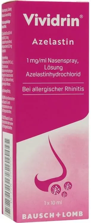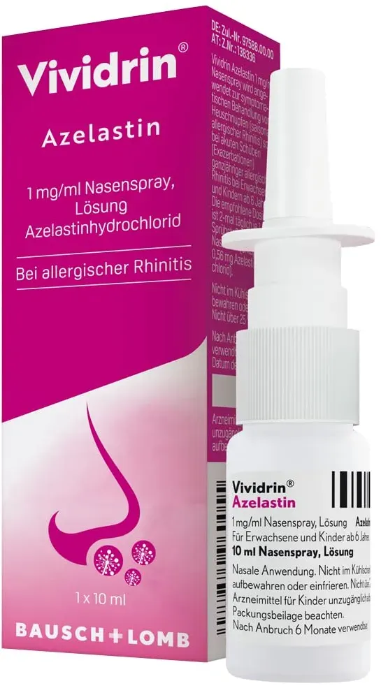 699,00 / l - Kategorie: Arzneimittel - Bausch + Lomb - GTIN:4150129105523 - PZN:12910552 - Wichtige Hinweise (Pflichtangaben): Vividrin Azelastin 1 mg/ml Nasenspray, Lösung . Wirkstoff: Azelastinhydrochlorid. Anwendungsgebiete: Zur symptomatischen Behandlung von Heuschnupfen (saisona... - 6,99 Euro bei Mycare - gefunden von billiger.de Dieses Azelastin Nasenspray ist mit 7.40 Euro eine beliebte Wahl für schnelle Linderung bei Pollenallergie. ![]() ![]() Bausch + Lomb Vividrin Azelastin Nasenspray Allergie - Schnell wirksam gegen Pollenallergie - Effektiver Schutz bei Heuschnupfen - Antiallergisches Nasenspray für Erwachsene & Kinder ab 6 Jahren (1 x 10 ml)