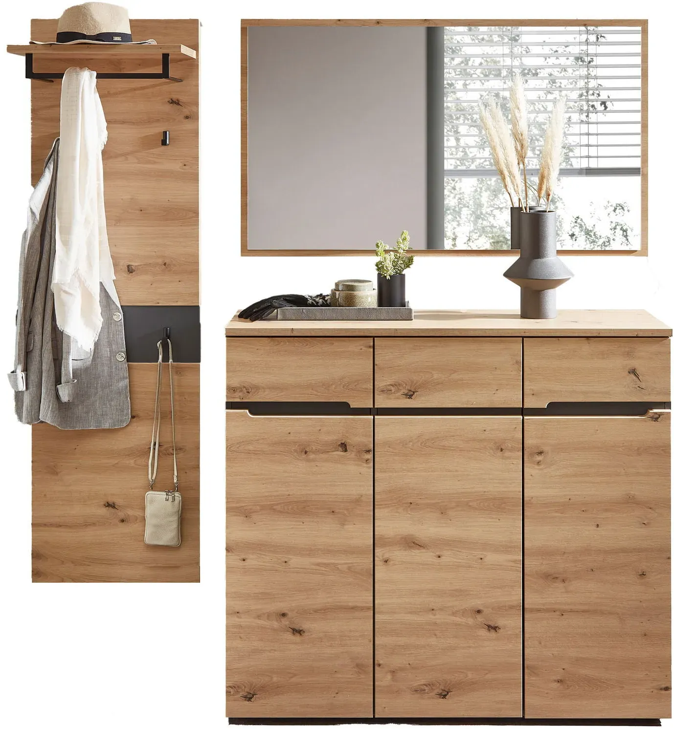 Kategorie: Dielenmöbel - VOLEO - GTIN:4250314555093 - Voleo Garderoben-Set DETROIT: Stilvolle Modernität trifft Funktionalität. Entdecken Sie das Voleo Garderoben-Set DETROIT, das mit seinem modernen und trendigen Design Ihren Eingangsbereich aufwertet. Die Front und der Korpus in Eiche Artisan verleihen dem Set eine warme, natürliche Ausstrahlung, während die Absetzungen in Graphit für einen stilvollen Kontrast sorgen. Die robusten Drehtüren gewähren einfachen Zugang zu den geräumigen Aufbewahrungsmöglichkeiten. Das Set besteht aus einem funktionalen Paneel, einem eleganten Spiegel und einem großzügigen XL-Schuhschrank, die zusammen für Ordnung und Stil sorgen. Die Holznachbildung bietet eine pflegeleichte und langlebige Oberfläche, die den Alltag problemlos meistert.Garderoben-Set DETROIT: Eleganz und Funktion vereintDas Voleo Garderoben-Set DETROIT besticht durch seine Kombination aus eleganter Optik und hoher Funktionalität. Der XL-Schuhschrank bietet mit seinen drei Türen ausreichend Platz für Ihre Schuhsammlung, während das großzügige Paneel mit den Maßen 50x170x30cm praktischen Stauraum für Jacken und Accessoires bereitstellt. Der stilvolle Spiegel in der Größe 120x70cm komplettiert das Set, ideal um den letzten Blick auf das Outfit zu werfen, bevor Sie das Haus verlassen. Verleihen Sie Ihrem Eingangsbereich eine moderne Note und erleben Sie die perfekte Kombination aus Design und Funktion. Bestellen Sie jetzt und verwandeln Sie Ihr Zuhause! - 523,00 Euro bei ... Dieses Garderoben-Set bietet eine umfassende Lösung für den Eingangsbereich zu einem fairen Preis. Zurbruegge n.de Voleo Garderoben-Set DETROIT, Holznachbildung