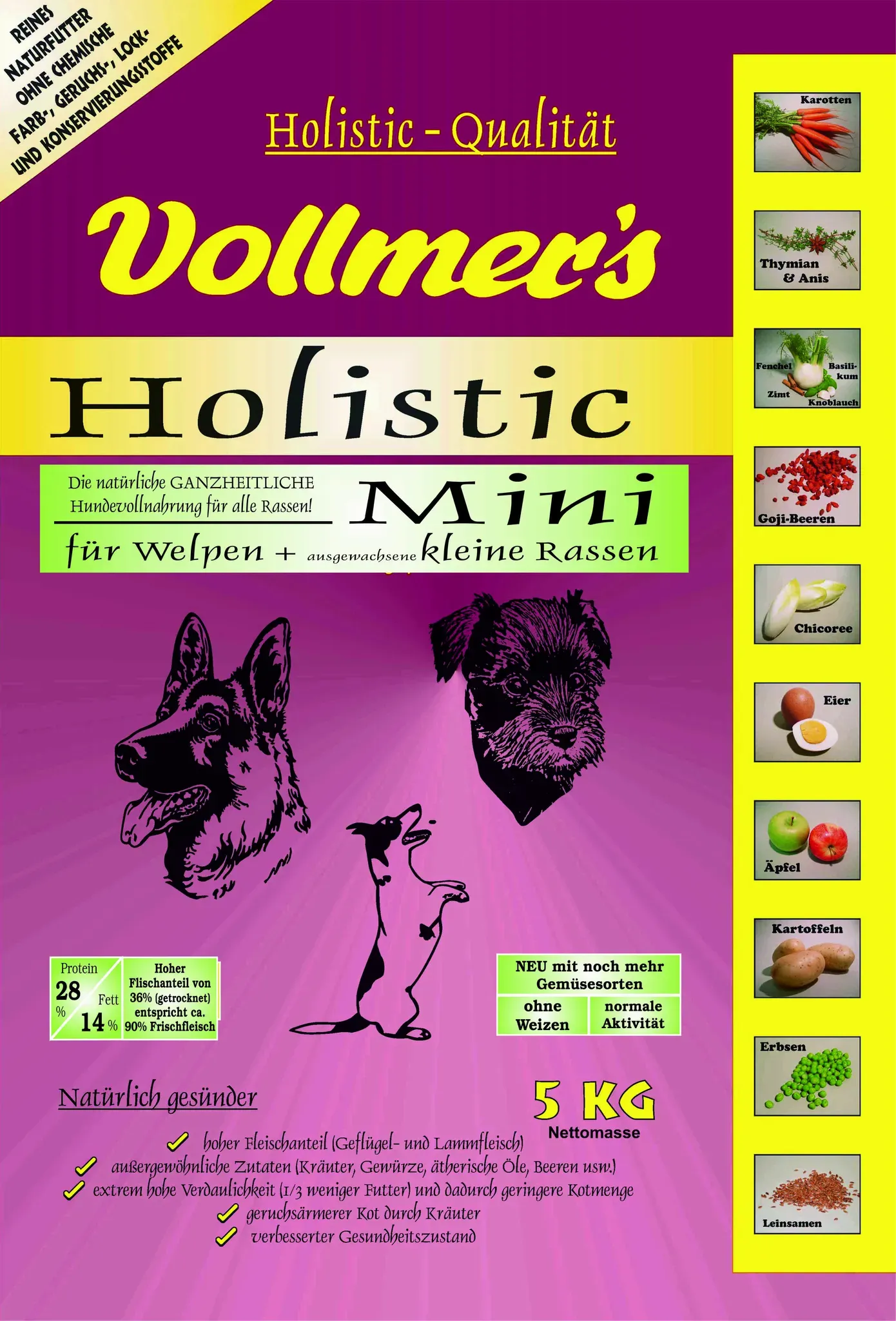 11 Händlerangebote bei billiger.de - Kategorie: Hundefutter - Vollmer's - Eine vielfältige und ausgewogene Ernährung legt den Grundstein für ein gesundes Leben das gilt für Menschen als auch für Tiere. Vollmer s Holistic ist eine ganzheitliche Vollnahrung auf Fleischbasis, angereichert mit ausgewählten pflanzlichen Zutaten. Schon der Wolf ernährte sich nicht nur von der erlegten Beute, sondern ergänzte instinktiv seine Nahrung mit Pflanzen, Beeren, Obst, Knollen, Gräsern, Kräutern und Gemüse. All diese Zutaten sind in Vollmer s Holistic zu finden - Spinat, Pastinake, Tomate, Paprika, Rübenschnitzel, Karottentrester, Chicor e, Johannisbrot, Luzerne, äpfel und Hefen sind voller ausgewählter Faserquellen, die auf unterschiedliche Weise auf den Gesamtorganismus des Tieres wirken. Sie fördern die Verdauung, begünstigen eine effektivere Nährstoffverwertung und unterstützen eine gesunde Darmflora. In den Faserquellen sind die probiotischen Substanzen der FOS (pflanzliche Faserstoffe) und MOS (Kohlenhydratverbindungen) enthalten. Sie verbessern das Darmmilieu, indem sie das Wachstum der günstigen Darmbakterien fördern und das der ungünstigen unterdrücken. - Leinsamen, Lachsöl und L-Carnitin liefern wichtige Omega 3 Fettsäuren, die vom Hund nicht selbst gebildet werden können. Weitere Bestandteile sind die EPA und DHA Fettsäuren, die nur im Lachsöl vorkommen. Sie verbessern das Fell und Haarkleid, stärken das Immunsystem, beugen Allergien, Fruchtbarkeitsstörungen und Herzerkrankungen ... ![]() ![]() Vollmer's Holistic Mini 15 kg