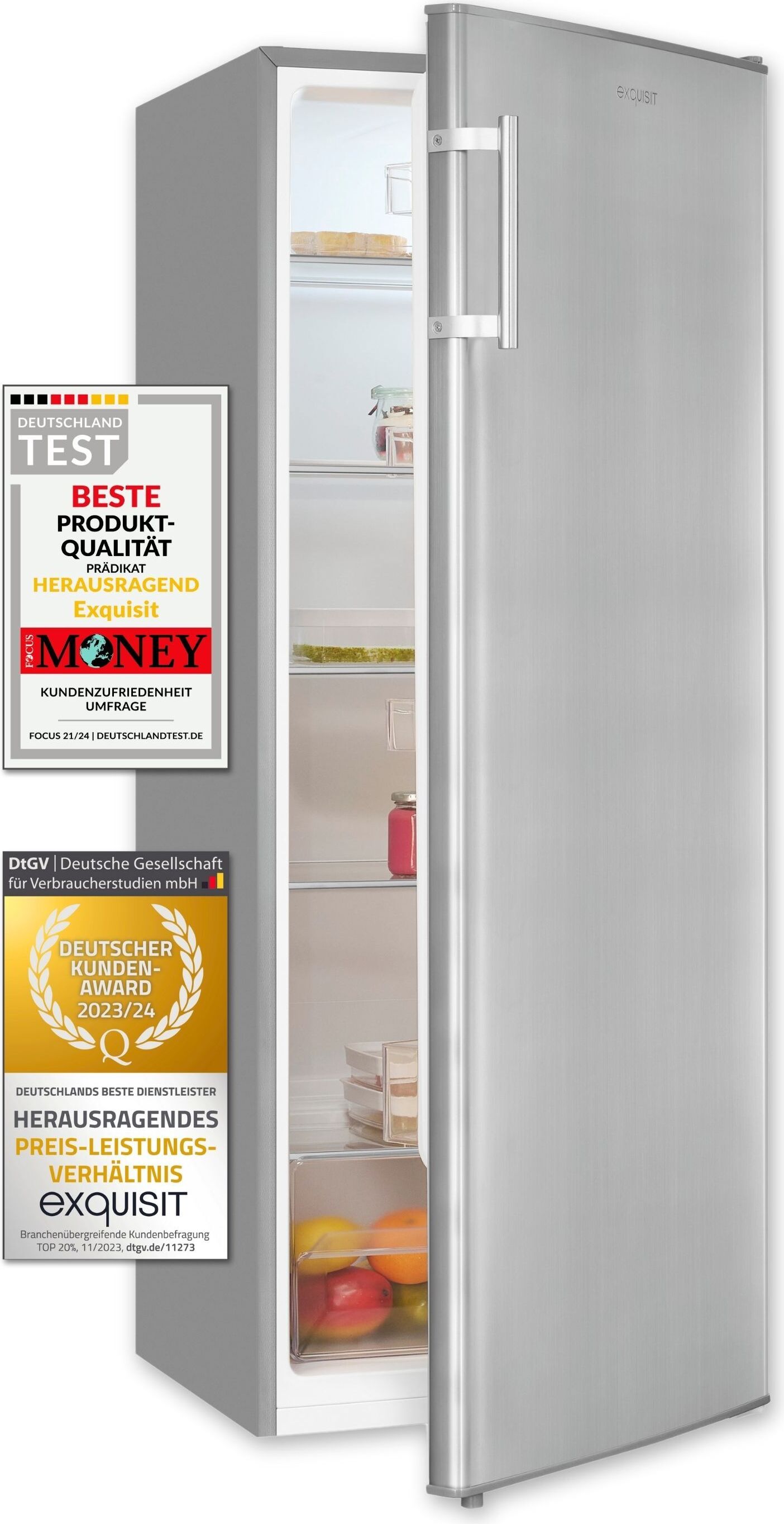 Auf Lager Versand durch AmazonExquisit Vollraumkühlschrank, 242 Liter, 5 Ablagen, LED-Beleuchtung, Temperaturregler, 55 cm Breite, KS5320-V-H-040E inoxlook-az