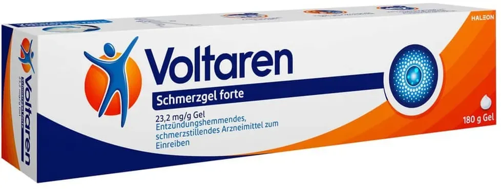 Haleon Germany GmbH - EAN: 4150069987845 - Voltaren Schmerzgel 1,16% - Schmerzlinderung und EntzündungshemmungDas Original Voltaren Schmerzgel mit Diclofenac wirkt 3-fach: Es stoppt den Schmerz, bekämpft die Entzündung und beschleunigt die Heilung. Es vereint die Eigenschaften eines Gels und einer Creme zieht schnell ein, kühlt und pflegt zugleich.Beim Auftragen dringt der Wirkstoff Diclofenac tief in die Haut ein und konzentriert sich gezielt an der entzündeten Stelle. Hier entfaltet das Schmerzgel seine bewährte 3-fach-Wirkung.Die Schmerzcreme wird zur Schmerzlinderung und Entzündungshemmung in den folgenden Fällen empfohlen:Bei akuten Muskelschmerzen (z.B. im Rückenbereich)Bei akuten Zerrungen, Verstauchungen oder Prellungen infolge stumpfer Traumen, z.B. Sport- und UnfallverletzungenBei Schmerzen der gelenknahen Weichteile (z. B. Schleimbeutel, Sehnen, Bänder) bei Arthrose der Knie- und FingergelenkeBei Entzündung der Sehnenansätze im Bereich des Ellenbogens, auch Tennisellenbogen bzw. Golferellenbogen genanntAnwendung:Tragen Sie Voltaren Schmerzgel in Abhängigkeit von der Schmerzintensität drei- bis viermal täglich auf. Je nach Größe der zu behandelnden schmerzhaften Stelle ist eine kirsch- bis walnussgroße Menge erforderlich.Hinweis: Mit Komfort-Applikator für saubere Hände. Hinweis: Der Wirkstoff Diclofenac kann für die Umwelt schädlich sein und sollte daher nicht ins Abwasser gelangen. Bitte beachten Sie bei der äußerlichen Anwendung Diclofenac-haltiger ... Das günstigste Einzelangebot für das stärkere Voltaren Schmerzgel forte 180g. ![]() ![]() Haleon Voltaren Schmerzgel forte 23,2 mg/g 180 g