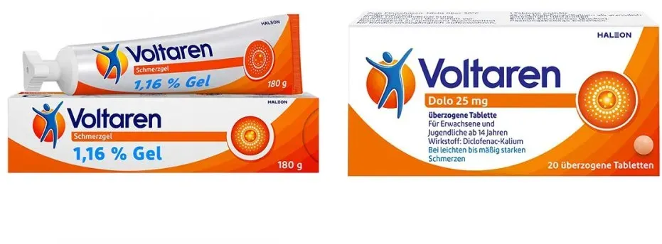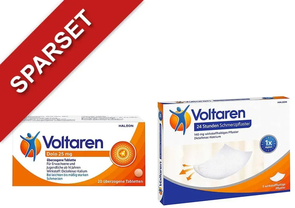 Kategorie: Pflaster - Haleon - Anwendungsgebiet von Voltaren Dolo 25mg 20Stück + Voltaren Schmerzpflaster 5StückVoltaren Dolo 25mg - Schmerztabletten bei Muskelschmerzen, Nackenschmerzen, Gelenkschmerzen, Schulterschmerzen und Rückenschmerzen mit Diclofenac. SCHNELLE & EFFEKTIVE SCHMERZLINDERUNG: Klinisch belegte Linderung von Rückenschmerzen, Muskelschmerzen, Nackenschmerzen, Gelenkschmerzen, Schulterschmerzen und Rückenschmerzen. Die kleine Tabeltte ist besonders praktisch für unterwegs. Die Volaren Tabletten BEKäMPFEN ENTZüNDUNGEN: Der Wirkstoff Diclofenac lindert Schmerzen und wirkt entzündungshemmend SCHNELLE SCHMERZLINDERUNG DANK SCHMERZTABLETTEN: Diclofenac, der Wirkstoff von Voltaren Dolo, wirkt schnell und entzündungshemmend. BEI RüCKEN- UND MUSKELSCHMERZEN: Effektive Linderung von Schmerzen z. B. im unteren Rücken LEICHT ZU SCHLUCKEN: Die kleinen Tabletten sind leicht zu schlucken DOSIERUNG: Mit bis zu drei Tabletten am Tag Rückenschmerzen den Kampf ansagen* *max. vier Tage lang WIE PROFITIEREN SIE? Lassen Sie nicht zu, dass Sie wegen Ihrer Schmerzen das Wichtigste aus den Augen verlieren. Mit Voltaren Dolo, den kleinen Schmerztabletten mit großer Wirkung, können Sie Ihren Alltag wieder aktiv gestalten. Der Wirkstoff Diclofenac lindert nicht nur spürbar Schmerzen, sondern bekämpft gleichzeitig eine ihrer häufigsten Ursachen die Entzündung. Voltaren Dolo sind Schmerztabletten bei Muskelschmerzen, Nackenschmerzen, Gelenkschmerzen, Schulterschmerzen und ... Dieses Set mit Voltaren Schmerzgel und Dolo Tabletten ist ideal für die kombinierte Behandlung von Schmerzen, sowohl topisch als auch oral. ![]() ![]() Haleon Voltaren Schmerzgel 11,6 mg/g 180g + Voltaren Dolo 25mg 20Stück