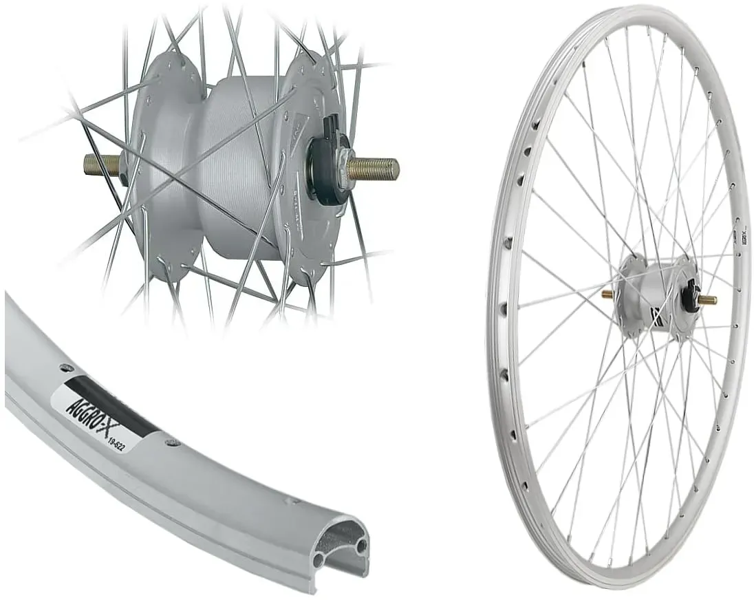 Kategorie: Fahrrad-Laufräder - aggro-x - GTIN:4260439681577 - AGGRO-X 28 Zoll Vorderrad mit Nabendynamo silber 6V / 3Watt - 52,90 Euro bei Amazon Marketplace Sports - gefunden von billiger.de Ein gutes Preis-Leistungs-Verhältnis für ein V-Profil Hohlkammer-Vorderrad mit Nabendynamo. ![]() ![]() AGGRO-X 28 Zoll Aluminium V-Profil Hohlkammer Vorderrad Nabendynamo 19-622 Felgenbremse 6V 3 Watt