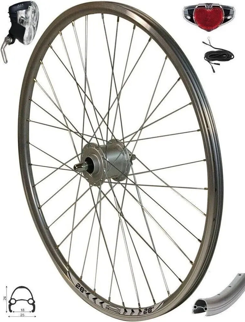 Beliebte Modelle und Marken: | Marke/Modell | Besonderheiten | Einsatzbereich | |------------------------------|------------------------------------------------|-------------------------| | Shimano Deore DH-3N72 | Zuverlässig, robust, für Felgenbremsen | Trekking, Citybikes | | SON 28 | Hochwertig, witterungsbeständig, Druckausgleich | Premium, lange Haltbarkeit | | Vuelta 28 Zoll Vorderrad | Made in Germany, leicht, stabil, inkl. Dynamo | Vielseitig, City & Rennrad | | X-Plorer 28" mit Shimano Dynamo | Robuste Felge, 36 Speichen, Schnellspanner | City, Trekking | Preisbereich: