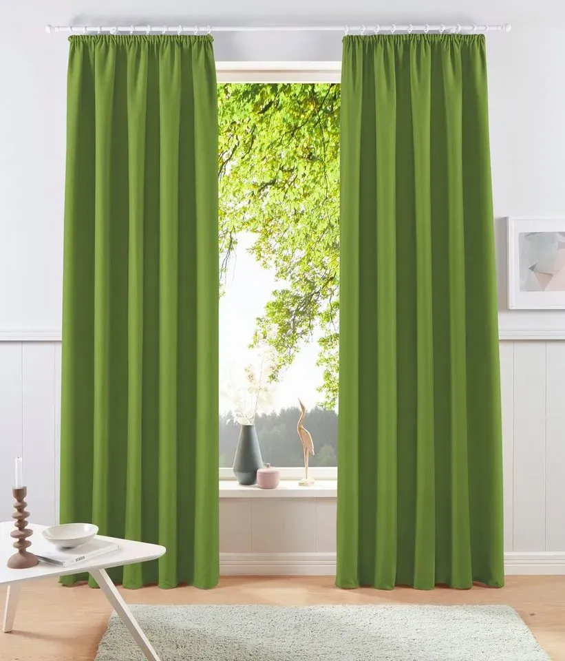 lieferbar-in 1-2 Werktagen bei dirmy home Vorhang Raja, Gardinen mit Kräuselband, Vorhänge Wohnzimmer (2 St), Kräuselband, blickdicht, Polyester, 2er-Set, Bestseller, einfarbig, modern, pflegeleicht, Mikrofaser grün 140 cm x 145 cm