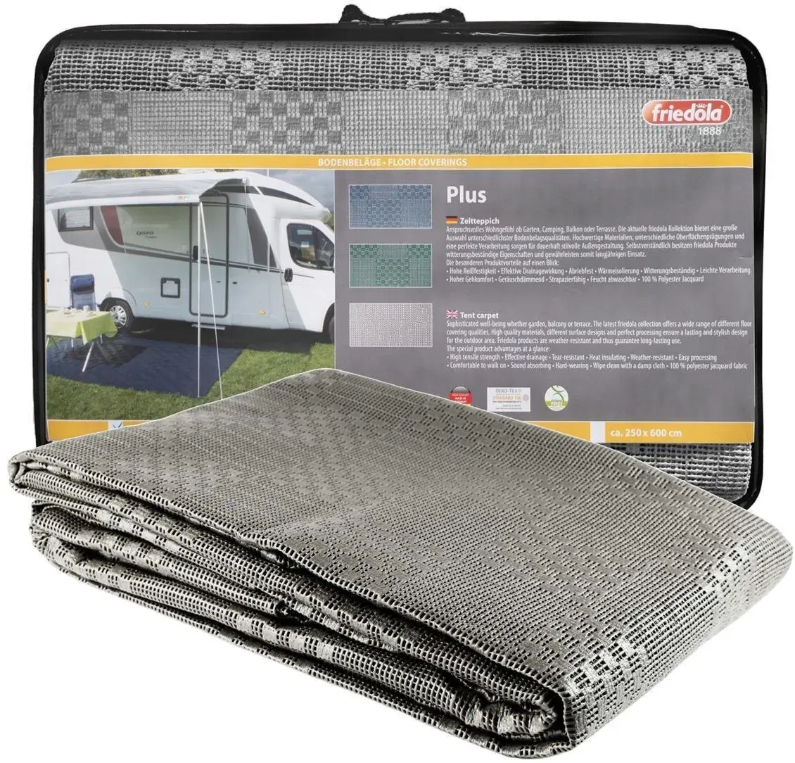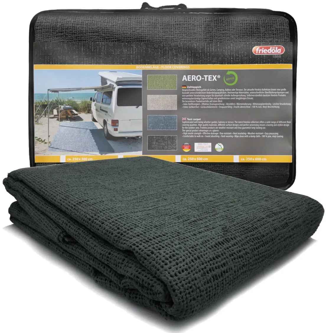 129,90 /Stück - Kategorie: Zelt-Zubehör - Friedola - GTIN:4056281864851 - Vorzeltteppich AEROTEX: Deine Komfortoase für Draußen Der Vorzeltteppich AEROTEX ist mehr als nur ein Teppich er ist Dein treuer Begleiter für die unterschiedlichsten Outdoor-Aktivitäten. Egal, ob Du ein gemütliches Lager beim Camping aufschlagen, Deinen Balkon verschönern, die Terrasse komfortabler gestalten oder einen Bereich im Garten hervorheben möchtest AEROTEX ist die optimale Wahl. Hohe Reißfestigkeit & Effektive Drainagewirkung Dieser vielseitige Campingteppich überzeugt nicht nur durch seine Optik in ansprechendem Anthrazit, sondern auch durch seine technischen Eigenschaften. Er ist aus 100% Jute mit einer robusten Vinyl-Beschichtung gefertigt, die ihm eine hohe Reißfestigkeit verleiht. Zusätzlich sorgt die effektive Drainagewirkung dafür, dass Wasser schnell abgeleitet wird, was ihn auch bei Regen schnell trocknen lässt. Neben seiner Strapazierfähigkeit bietet der Vorzeltteppich AEROTEX weiterhin einen hohen Gehkomfort und ist geräuschedämmend , was ihn ideal für lauschige Abende im Freien macht. Dank der Wärmeisolierung sind Deine Füße auch an kühleren Tagen warm und trocken. Die Pflege des Teppichs ist denkbar einfach, denn er ist feucht abwaschbar und damit ideal für den Einsatz im Freien geeignet. Zudem ist der AEROTEX nicht nur witterungsbeständig , sondern auch nach Oeko-Tex Standard 100 zertifiziert und phthalatfrei , was ihn zu einer verantwortungvollen und gesundheitlich ... Der Friedola PLUS Teppich bietet eine Premium-Qualität und ist in verschiedenen Farben erhältlich, was ihn zu einer vielseitigen Wahl macht. ![]() ![]() Friedola Vorzeltteppich PLUS - Grau - 250x600cm