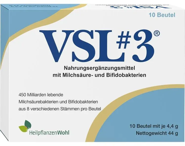 7 Händlerangebote bei billiger.de - Kategorie: Arzneimittel - Heilpflanzenwohl - Nahrungsergänzungsmittel auf Basis von lebenden probiotischen Stämmen. Enthält 4 Lactobacillusstämme, 3 Bifidobakterienstämme und 1 Streptokokkenstamm. Jeder Beutel enthält 450 Milliarden lebende Bakterien.Mit über 450 Milliarden Bakterien pro Dosis (Sachet), ist VSL#3 ist ein hoch dosiertes Probiotikum. Es hat 8 Bakterienstämme aus Milchsäure- und Bifidobakterien und Streptokokken, die natürlicherweise im menschlichen Darm vorkommen. Folgende Bakterien sind in VSL3 enthalten: ? Streptocccus thermophilus BT01, ? Bifidobacterium breve BB02, ? Bifidobacterium longum BL03 (Neu klassifiziert als B. animalis subsp. lactis BL03), ? Bifidobacterium infantis BI04 (Neu klassifiziert als B. animalis subsp. lactis BI04), ? Lactobacillus acidophilus BA05, ? Lactobacillus plantarum BP06, ? Lactobacillus paracasei BP07, ? Lactobacillus delbrueckii subsp. bulgaricus BD08 (Neu klassifiziert als L. helveticus). Durch die Kühlung ist die Lebensfähigkeit der Bakterien gesichert. Diese können sich zu 120 Minuten in den Verdauungssäften halten, damit sie den Darm lebend erreichen und sich dort ansiedeln können. Wir ren, dass die Bakterien im Kühlschrank frisch bis zum Mindesthaltbarkeitsdatum überleben. Verzehrempfehlung: Die empfohlene Verzehrmenge ist 1 Beutel pro Tag. Rühren Sie den Inhalt eines Beutels in Wasser, Joghurt, Apfelsaft oder ein anderes Kaltgetränk ohne Kohlensäure ein und ... Dieses Angebot ist ideal für den Einstieg oder eine kurze Kur, da es eine kleinere Packungsgröße zu einem günstigen Preis bietet. Shop- apotheke.c om