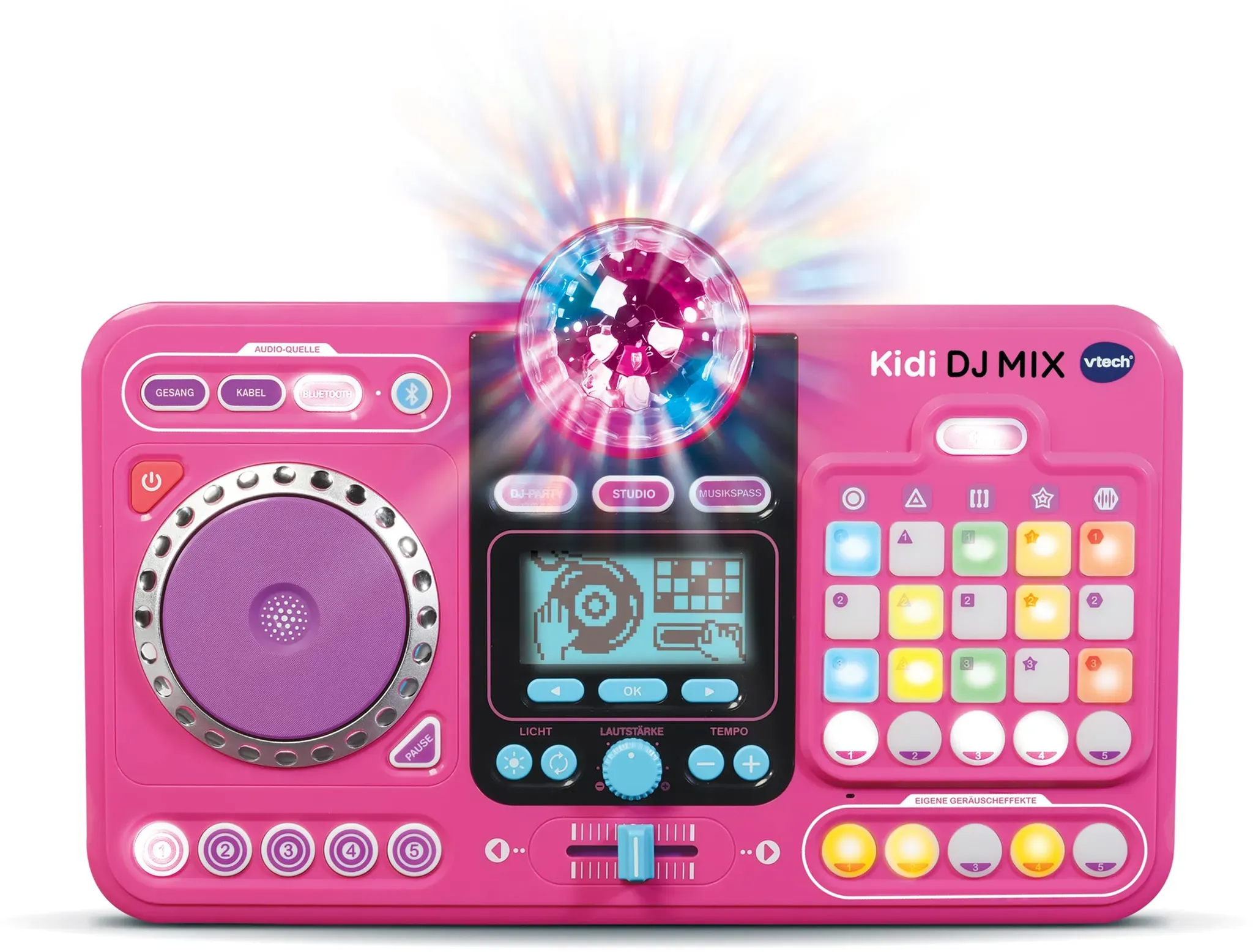 vtech - EAN: 3417765473043 - . Mit Jog-Wheel, LED-Launchpad, Crossfader, eingebautem Mikrofon und Display . über 2.000 verschiedene Licht- und Soundkombinationen . 15 Melodien aus verschiedenen Musikgenres (Hip Hop, Techno/House, Electro Pop) . Mit Discolicht, das passend zur Musik leuchtet . Coole Effekte mit dem Jog-Wheel erzeugen . Die selbst gemischten Songs speichern und immer wieder anhören . Mit tollen Musikeffekten die Geschwindigkeit variieren, die Tonspur ändern oder Lautstärke von Musik und Gesang verschieben . Externen Musik-Player via Kabel oder Bluetooth anschließen, die eigene Lieblingsmusik hören und mitsingen . 2 coole Musikspiele . Mit Kopfhörer- und Netzanschluss . Integrierter Lautsprecher und Lautstärkeregler . Kindersicheres Batteriefach und Abschaltautomatik (Demobatterien sind enthalten) . Benötigte Batterien: 4x AA . Maße: 23,5 x 9,2 x 36,5 cm (BxHxT) . Selber Musik mischen, Geräuscheffekte zur Musik hinzufügen und zu den eigenen Kreationen singen Merkmale: Produktart: Mischpult Altersempfehlung: ab Material: Kunststoff Ausführung: elektronisch Hinweis: Achtung! Nicht für Kinder unter n geeignet! Erstickungsgefahr wegen verschluckbarer Kleinteile. - bei bueromarkt-ag.de - aus Yadore Produktdaten Babywalz bietet die pinke KIDITRONICS Version für 57.99 Euro an, ideal für alle, die diese Farbvariante bevorzugen. ![]() ![]() Vtech KIDITRONICS Kidi DJ Mix, pink