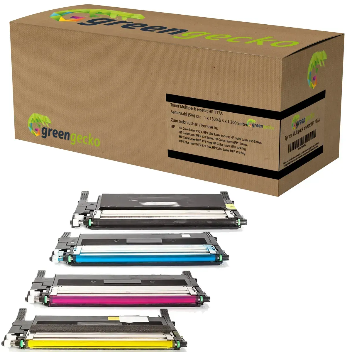 D&C - EAN: 4251263739862 - Kompatibel 4er Sparset Toner HP 117A BK / W2070A, 117A C / W2071A, 117A M / W2073A , 117A Y / W2072A alle Farben Tonerpatronen. Unsere D&C Tonerkartuschen ersetzen die entsprechenden original Toner Ihres Druckers. Ersetzt Bezeichnung: 117A BK /... - bei metro.de - aus Yadore Produktdaten Das green gecko Sparset bietet eine umweltfreundlichere Alternative mit guter Kapazität. ![]() ![]() druckdichaus XXL green gecko Toner Sparset kompatibel zu HP 117A / W2070A - W2073A schwarz, c...