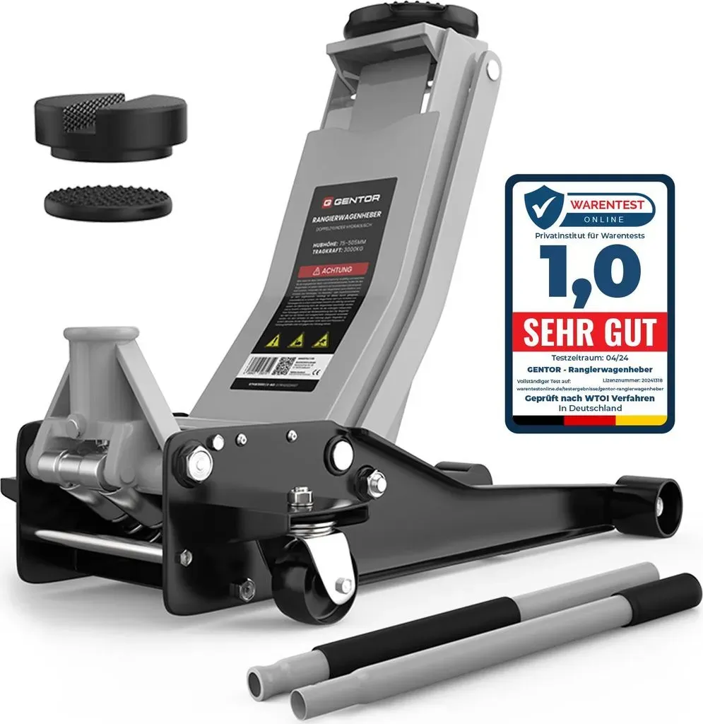 Kategorie: Werkstatteinrichtung - CARGO VA Intelligent Vehicle Accessories - GTIN:8720726569835 - VON SPORTWAGEN BIS SUV: Eine Lösung für deine Garage. Mit einer extremen Hubhöhe von 75mm bis 505mm ist dieser Rangierwagenheber ideal für tiefergelegte Autos & hohe SUVs. Du erreichst mühelos jeden Aufnahmepunkt. DOPPELTE POWER, HALBE PUMPZEIT: Der professionelle Doppelzylinder-Antrieb hebt dein Fahrzeug deutlich schneller und mit weniger Hüben an. Erlebe die Effizienz und Zeitersparnis eines echten Profi-Werkzeugs bei jedem Reifenwechsel. DAS KOMPLETTE PROFI-TOOLKIT: Du erhältst mehr als nur einen Wagenheber. Im Set enthalten sind: eine ergonomische Gelenkschutzmatte, ein Reifenprofilmesser zur Sicherheitskontrolle und zwei hochverdichtete Gummiauflagen für maximalen Fahrzeugschutz. MASSIVE BAUWEISE, VOLLE KONTROLLE: 29,5 kg pulverbeschichteter Stahl sind dein Garant für Profi-Qualität und einen felsenfesten Stand. Der extralange Pumphebel (114,5 cm) sorgt dabei für optimale Kraftübertragung und souveräne Kontrolle. MEIN CARGOVA VERSPRECHEN: Als deutscher Gründer mit Handwerkstradition stehe ich für diese Qualität. Du erhältst und unser Versprechen auf Werkzeuge, die wir selbst nutzen: Kompromisslos robust, zuverlässig & durchdacht. - 114,95 Euro bei Amazon Marketplace Automotive - gefunden von billiger.de ![]() ![]() GENTOR Wagenheber hydraulisch 3T ? flach 75?505 mm Hubhöhe, mit 2X Gummiauflage, Profi Rangierwagenheber für Auto, PKW, SUV & Werkstatt (Hellblau)