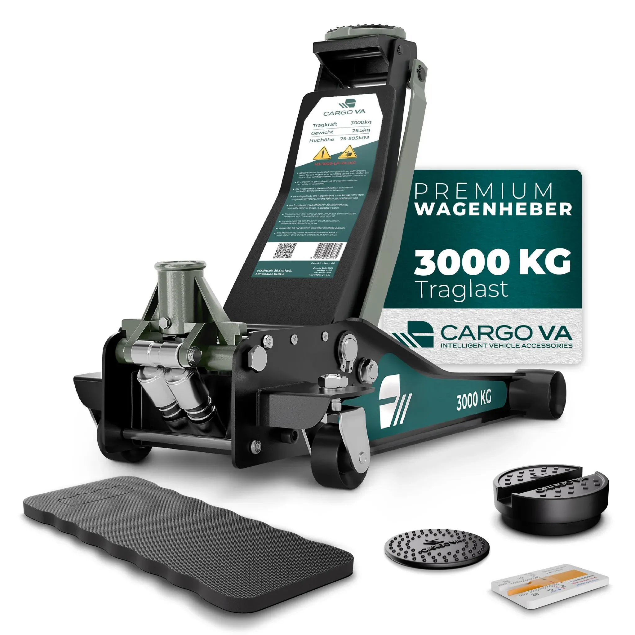 Zustand: Neu - Bodenzüge Kfz-Wagenheber - CARGO VA Intelligent Vehicle Accessories CargoVA - 8720726569835 - EAN: 8720726569835 - VON SPORTWAGEN BIS SUV: Eine Lösung für deine Garage. Mit einer extremen Hubhöhe von 75mm bis 505mm ist dieser Rangierwagenheber ideal für tiefergelegte Autos & hohe SUVs. Du erreichst mühelos jeden Aufnahmepunkt. DOPPELTE POWER, HALBE PUMPZEIT: Der professionelle Doppelzylinder-Antrieb hebt dein Fahrzeug deutlich schneller und mit weniger Hüben an. Erlebe die Effizienz und Zeitersparnis eines echten Profi-Werkzeugs bei jedem Reifenwechsel. DAS KOMPLETTE PROFI-TOOLKIT: Du erhältst mehr als nur einen Wagenheber. Im Set enthalten sind: eine ergonomische Gelenkschutzmatte, ein Reifenprofilmesser zur Sicherheitskontrolle und zwei hochverdichtete Gummiauflagen für maximalen Fahrzeugschutz. MASSIVE BAUWEISE, VOLLE KONTROLLE: 29,5 kg pulverbeschichteter Stahl sind dein Garant für Profi-Qualität und einen felsenfesten Stand. Der extralange Pumphebel (114,5 cm) sorgt dabei für optimale Kraftübertragung und souveräne Kontrolle. MEIN CARGOVA VERSPRECHEN: Als deutscher Gründer mit Handwerkstradition stehe ich für diese Qualität. Du erhältst und unser Versprechen auf Werkzeuge, die wir selbst nutzen: Kompromisslos robust, zuverlässig & durchdacht. - Verkäufer: CargoVA im amazon.de Marketplace ![]() ![]() CARGO VA Intelligent Vehicle Accessories CargoVA Wagenheber 3T hydraulisch | Flacher Wagenheber mit 75-505mm Hubhöhe | Profi-Toolkit inkl. Kniematte & 2X Gummiauflagen | Ideal für SUV & tiefergelegte Autos | Rangierwagenheber Reifenwechsel