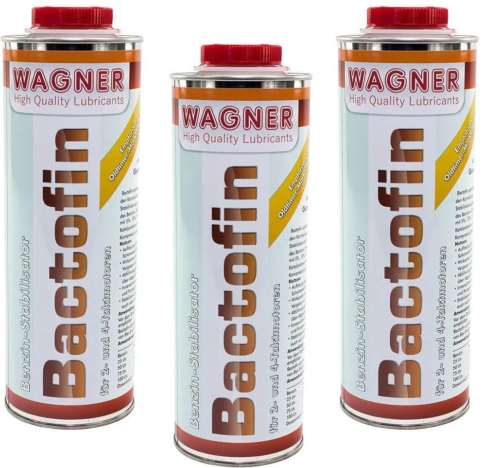 47.0 / l - Kategorie: Autoreinigung & Pflege - WAGNER SPEZIALSCHMIERSTOFFE - GTIN:4251595512638 - Schützt vor Ablagerungen. Sorgt für eine dauerstabile Zündfähigkeit. Korrosions- und Verschleißsschutz für Tank, Leitungen, Vergaser oder Einspritzsystem. Reinigungs- und Schmierwirkung. Hält das Kraftstoffsystem sauber. Stabilisiert den Kraftstoff über einen längeren Zeitraum. Wirkt auch als Bleiersatz. Auflösung bakterieller Verunreinigungen. Abführung gebundenen Wassers und gelöster Rückstände über Abgasstrom. Hergestellt in Deutschland !!!!!!!!!!. Hersteller: Wagner Spezialschmierstoffe. Lieferinhalt: 2 Stück 1 Liter wird wie auf dem Produktbild abgebildet geliefert. - 93,99 Euro bei Amazon Marketplace Automotive - gefunden von billiger.de Dieses Dreierpack mit 3x 1 Liter ist die größte verfügbare Menge und bietet das beste Preis-Leistungs-Verhältnis für Großverbraucher. ![]() ![]() WAGNER SPEZIALSCHMIERSTOFFE Bactofin Benzin Stabilisator Tankrostschutz 3 Stück 1 Liter