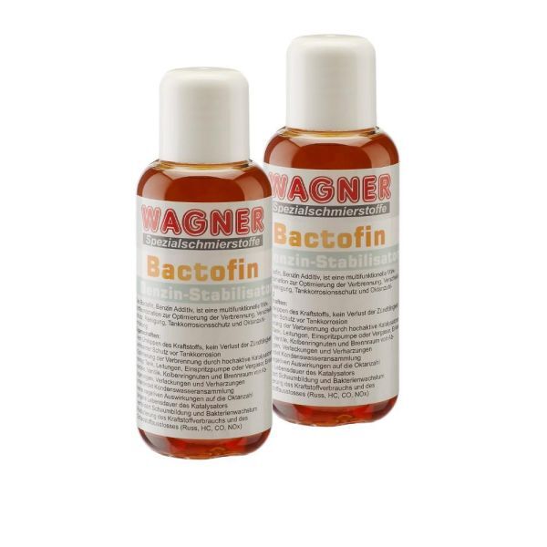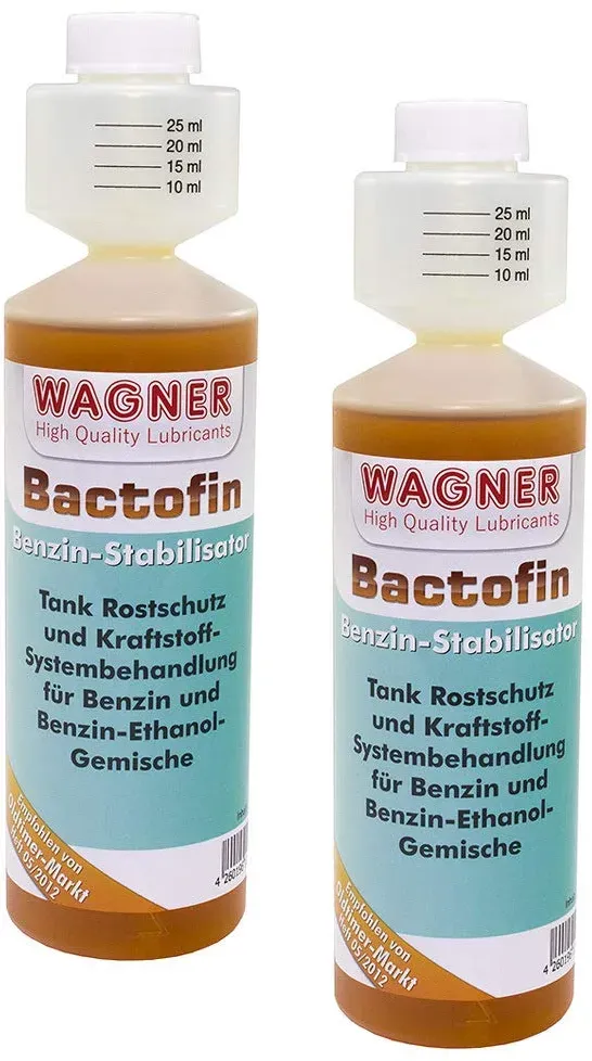 79.96 / l - Kategorie: Additive - Wagner - MAXIMALER SCHUTZ FüR BENZINMOTOREN: Das Benzin Additiv schützt zuverlässig vor Korrosion, Verschleiß und Ablagerungen. Wirksam ist der Benzin Stabilisator in 2- und 4-Takt-Motoren, und sorgt für eine längere Lebensdauer deines Motors, auch bei seltenem Gebrauch oder überwinterung. UNIVERSELL ANWENDBAR: Bactofin ist einsetzbar in allen Benzinmotoren: Autos, Oldtimer, Motorräder, Boote, Rasenmäher, Motorsägen, Aggregaten und mehr. Die Additive Benzin Motor funktionieren auch perfekt mit Benzin-Ethanol-Mischungen bis zu einem Ethanol-Anteil von 85%, bei gleichbleibender Stabilisierung und Reinigungskraft. STABILISIERT BENZIN BEI LANGER STANDZEIT: Verhindert das 'Kippen' des Benzins und hält es über Monate hinweg frisch und einsatzbereit. Idealer Benzin Zusatz für Fahrzeuge, Boote und Geräte, die über 6 Wochen oder länger nicht benutzt werden, wie z. B. während der Winterpause. BEKäMPFT BAKTERIEN UND VERUNREINIGUNGEN: Die spezielle Formel der Aditive Benziner entfernt Bakterien, Schaum und Schlamm, die durch Ethanol im Benzin entstehen und das Kraftstoffsystem verunreinigen. Schützt vor verstopften Leitungen und sorgt für einen reibungslosen Motorlauf. ERSETZT BLEI-ZUSäTZE UND SCHMIERT VENTILE: Das Benzin Zusatz Additiv sorgt für eine optimale Schmierung der Ventile und macht den Einsatz von Blei-Ersatz überflüssig. Das Produkt gewährleistet so die volle Funktion deines Motors, auch bei älteren Fahrzeugen und Maschinen. - 19,99 Euro ... Ein weiteres 250ml Angebot zu einem attraktiven Preis, ideal für die Überwinterung von Fahrzeugen. ![]() ![]() Wagner Bactofin Benzin Stabilisator für 2-&4-Takt-Otto-Motoren, Fahrzeuge Aller Art&Baujahre, Boote, Kleingeräte| Benzin Additiv Verhindert Korrosion&Verunreinigungen ? für Überwinterung (250ml)