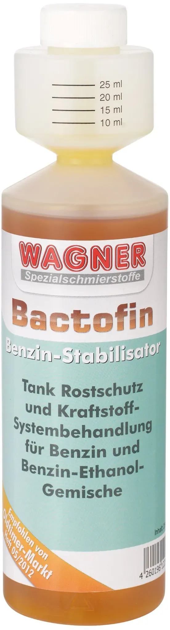 Kategorie: Additive - Wagner - GTIN:4260196124010 - MAXIMALER SCHUTZ FüR BENZINMOTOREN: Das Benzin Additiv schützt zuverlässig vor Korrosion, Verschleiß und Ablagerungen. Wirksam ist der Benzin Stabilisator in 2- und 4-Takt-Motoren, und sorgt für eine längere Lebensdauer deines Motors, auch bei seltenem Gebrauch oder überwinterung. UNIVERSELL ANWENDBAR: Bactofin ist einsetzbar in allen Benzinmotoren: Autos, Oldtimer, Motorräder, Boote, Rasenmäher, Motorsägen, Aggregaten und mehr. Die Additive Benzin Motor funktionieren auch perfekt mit Benzin-Ethanol-Mischungen bis zu einem Ethanol-Anteil von 85%, bei gleichbleibender Stabilisierung und Reinigungskraft. STABILISIERT BENZIN BEI LANGER STANDZEIT: Verhindert das 'Kippen' des Benzins und hält es über Monate hinweg frisch und einsatzbereit. Idealer Benzin Zusatz für Fahrzeuge, Boote und Geräte, die über 6 Wochen oder länger nicht benutzt werden, wie z. B. während der Winterpause. BEKäMPFT BAKTERIEN UND VERUNREINIGUNGEN: Die spezielle Formel der Aditive Benziner entfernt Bakterien, Schaum und Schlamm, die durch Ethanol im Benzin entstehen und das Kraftstoffsystem verunreinigen. Schützt vor verstopften Leitungen und sorgt für einen reibungslosen Motorlauf. ERSETZT BLEI-ZUSäTZE UND SCHMIERT VENTILE: Das Benzin Zusatz Additiv sorgt für eine optimale Schmierung der Ventile und macht den Einsatz von Blei-Ersatz überflüssig. Das Produkt gewährleistet so die volle Funktion deines Motors, auch bei älteren Fahrzeugen und Maschinen. - ... Diese 250ml Dosierflasche ist besonders praktisch in der Anwendung. ![]() ![]() WAGNER Bactofin - 0,25 Ltr. eBay 250ml Benzin Stabilisator in praktischer Dosierflasche