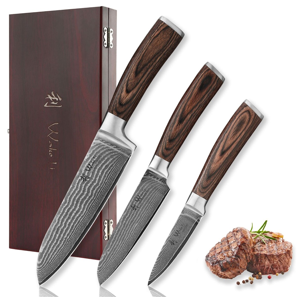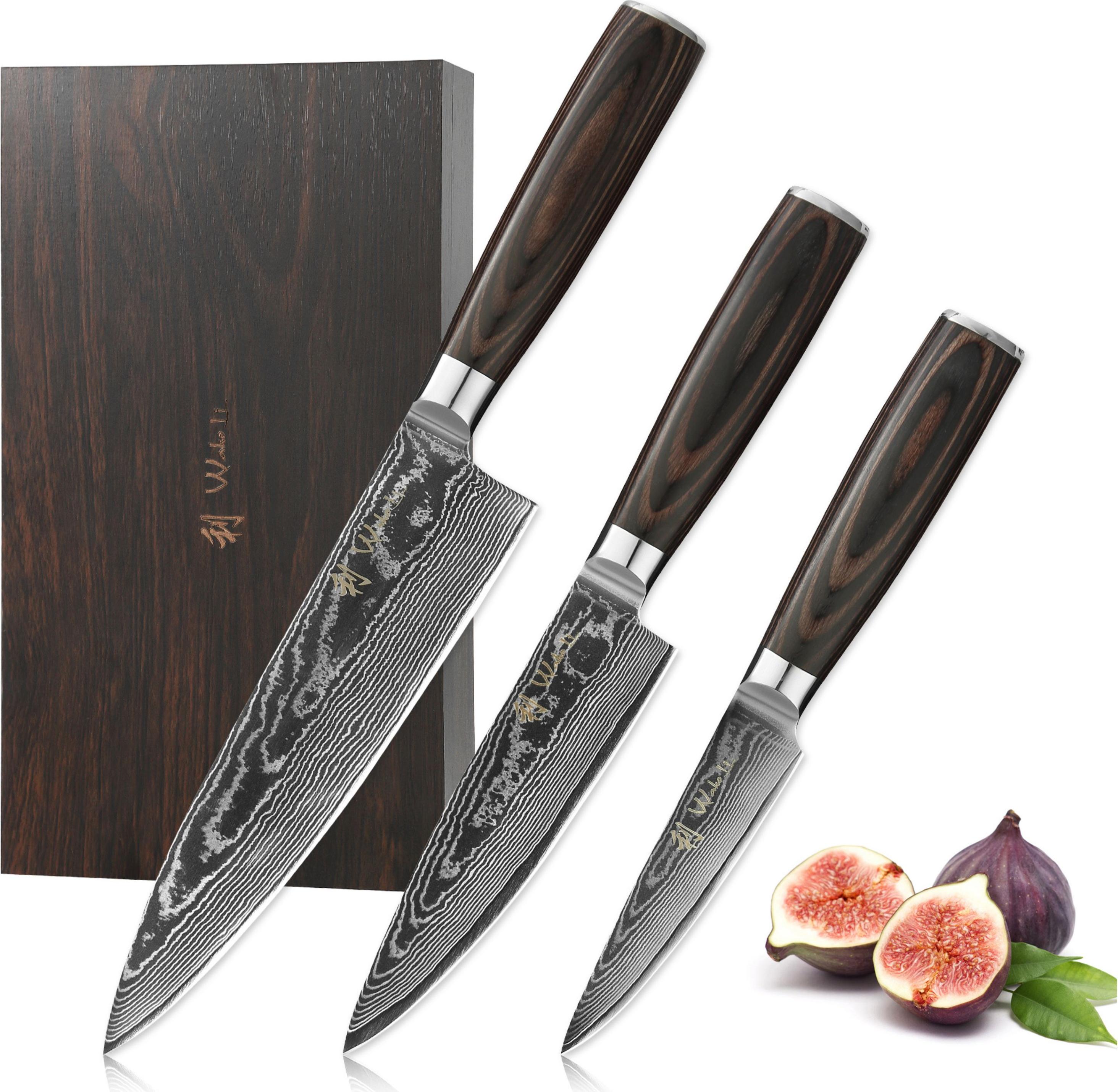 3 Händlerangebote bei billiger.de - Kategorie: Küchenmesser - Wakoli - Produktdetails Art Griff , ergonomischer Griff, Eigenschaften Griff , ergonomisch geformt, für Rechts- und Linkshänder geeignet, Pakkaholzgriff, Material Material , Damaststahl, VG10, Materialeigenschaften , Damaststahl, VG-10 Kern, Hinweise Pflegehinweise , Handwäsche, keine Spülmaschine, - GTIN:4250567709373 ![]() Wakoli Edib 3er Damastmesserset I Holzbox I 8 - 17cm Klinge I Pakkaholzgriff