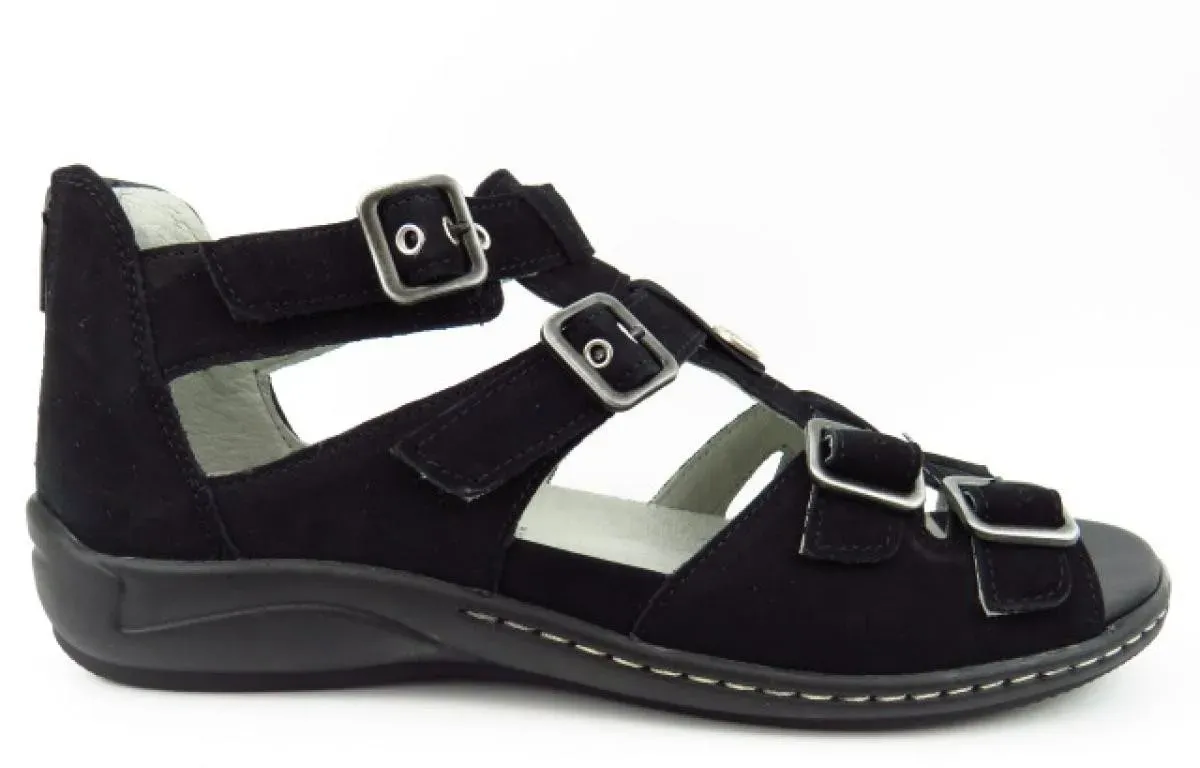EAN: 4045266669789 - Waldläufer Damen Sandalen Schwarz Rauleder - Fersenreißverschluss - obere Riemen mit Klettverschluss - vordere Riemen mit Dornverschluss - herausnehmbare, gepolsterte Decksohle - sehr flexible Laufsohle Laufkomfort spürbar erleben herausnehmbares Fußbett mit Klett stabilisiert schmale Ferse dezent integrierter Klettverschluss in Schnallenoptik Reißverschluss an der Ferse äußerst bequeme Waldläufer Sandale hoher Tragekomfort Nutzertyp: DamenForm: SandalenFarbe: Schwarz Sportive Sandalette aus geschmeidigem Nubuk. Ferse geschlossen. Mit idealer Passform durch vier Schnallen, davon zwei als versteckte Klettriegel. Leichter Einstieg über Fersenreissverschluss. Weite: H für kräftige Füße Absatz: 20 mm Keilsohle Farbe: SCHWARZ Obermaterial: Nubuk Futter: Leder Laufsohle: PU/Luftpolstersohle Fußbett: Wechselfußbett lederüberzogen Da freut sich Ihr Fuß: Mit der Sandale HILENA aus dem Hause Waldläufer wird laufen zum Vergnügen. Durch das hochwertige Nubukleder ist das Obermaterial wunderbar anpassungsfähig. Die angeraute Oberfläche ist besonders weich und angenehm zu tragen. Das exzellente Innenleben aus bestem Leder gibt Ihnen ein erholsames Gefühl an langen Tagen. Die lederbezogene, gepolsterte Einlegesohle ist herausnehmbar.Somit können eigene Einlagen verwendet werden. Der Schnitt ist für breitere Füße (Weite H) geeignet. Der Keilabsatz hat eine Höhe von cirka 1 cm ,die aus einem weichen PolyurethanMaterial bestehende Laufsohle schont die Gelenke und federt ... ![]() ![]() WALDLÄUFER Hilena Schwarz | Gr.: 38
