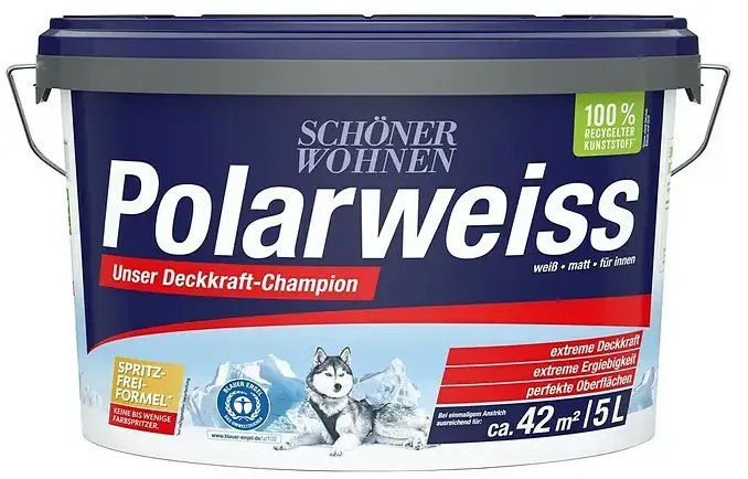 5.3 /l - Kategorie: Farben & Lacke - Schöner Wohnen - GTIN:4006559274042 - geruchsarm und umweltverträglich|scheuerbeständig und stapazierfähig|für alle Neu- und Renovierungsanstriche|frei von Lösemitteln, Weichmachern und Konservierungsmitteln|für Allergiker geeignet; Können deine 4 Wände einen neuen Anstrich gebrauchen? Dann solltest du dir die Farbe 'Polarweiss' von Schöner Wohnen Farbe einmal näher ansehen. Der klassische weiße Farbton sorgt für eine helle Atmosphäre. Dabei wird mit der Wandfarbe eine matte Oberfläche erzeugt. Mit einem Inhalt von 10 l kannst du sie vor allem zum Streichen großer Wände nutzen. Bei einem einmaligen Anstrich reicht die Menge für eine Fläche von 85 m2. Für ein ansprechendes Ergebnis werden allerdings 2 Farbaufträge empfohlen. Zudem kannst du mit der Farbe viele Untergründe behandeln. Diese Farbe lässt deine Wände in neuem Glanz erstrahlen! Erfahre in unserem Ratgeber, wie du Wände richtig streichen kannst. - 39,99 Euro bei toom.de - gefunden von billiger.de ![]() ![]() Wandfarbe weiß - matt 5L eBay - für ca. 35m² / Polarweiß Innenfarbe, hohe deckend Farbe