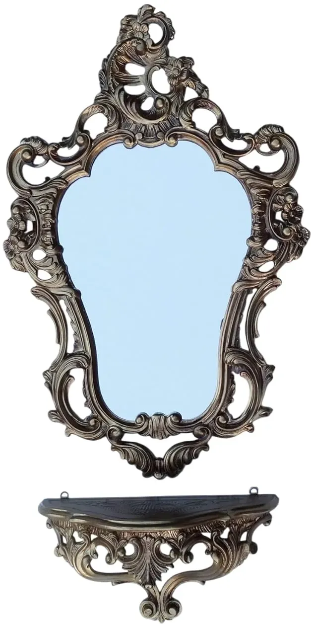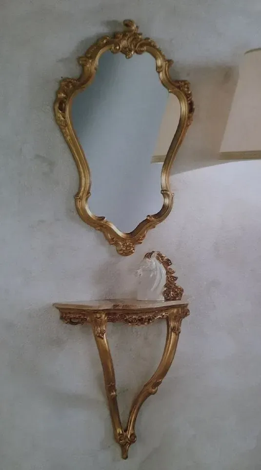Kategorie: Spiegel - Lnxp - GTIN:4212340129112 - 2 teiliges Set bestehend aus Wandspiegel + Wandkonsole Spiegelabmessungen: *Außenmaße: ca. 76 x 50 cm. *Spiegelfläche: ca. 45 x 31 cm *Rahmengrösse ca.10 - 23 cm *Material: Poly-Natur Konsoleabmessungen: *Breite 38 cm - *Höhe 20 cm - *Tiefe 15,5 cm *Material: Poly-Natur *Made in Italy Farbe: Gold - *Material: Poly-Nature - Spiegelglas -Mdf Rückplatte Im trendigen Barock Stil für ihre Wohnung, strahlt Sinnlichkeit und Luxus aus. Lassen Sie sich von seinem antik barocken Charme verzaubern. - 79,90 Euro bei Amazon Marketplace Home - gefunden von billiger.de Diese Biscottini Wandkonsole in Antikoptik ist ein größeres, hochwertiges Stück, das als zentrales Dekorationselement dienen kann. ![]() ![]() Biscottini Wandkonsole antik Antikoptik, L50 x T24 x H40 cm | Barock wandregal Gold | Wandkonsole barock | Shabby deko | Barock Konsole