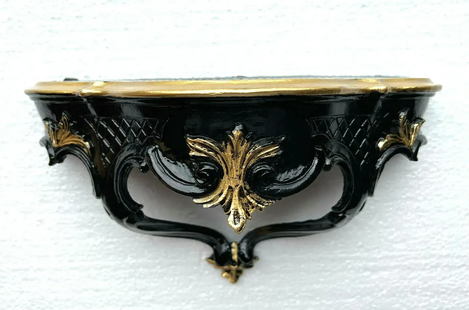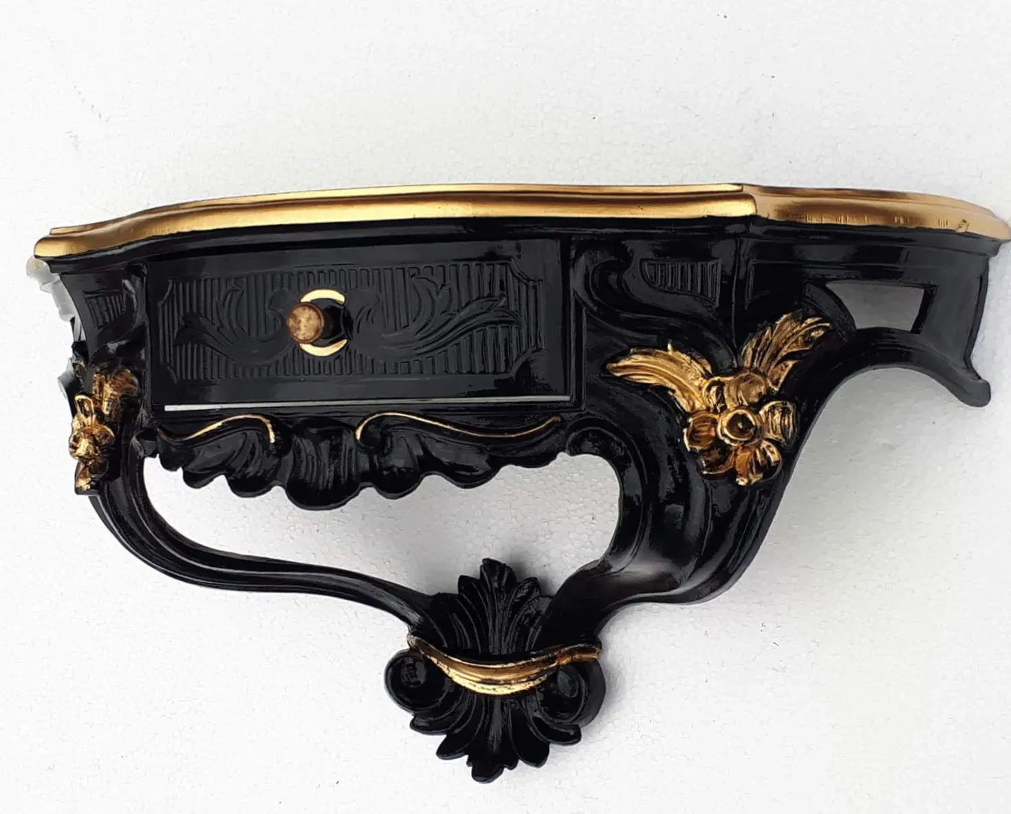 Kategorie: Zubehör für Möbel - Palazzo - GTIN:4250399970279 - Barocke Pracht in Miniatur Handbemalte Wandkonsole MARIE ANTOINETTE mit reich verziertem Rahmen und himmlischem Engelskopf in funkelnder Goldoptik. Historische Reproduktion Nostalgisches Accessoire, gefertigt nach altem Original; leichte Farbnuancen und Pinselstriche unterstreichen jedes Unikat. Hochwertige Materialien Stabiler Mix aus Holz und Polystein, kunstvoll patiniert und mit Glitzerelementen veredelt; pflegeleicht abwaschbar. Kompakte Ablagefläche Ca. 45 12 cm Ablage bietet Platz für Kerzen, Duftflakons oder kleine Skulpturen, ohne Ihre Wand zu dominieren (H 12 B 45 T 15 cm). Ablagefläche ca. 45cm x 12cm - 64,99 Euro bei Amazon Marketplace Home - gefunden von billiger.de Diese Wandkonsole mit Schublade bietet nicht nur eine stilvolle Ablage, sondern auch praktischen Stauraum. ![]() ![]() artissimo Wandkonsole mit Schublade Schwarz-Gold barock Stil Spiegelkonsole Wanddeko Antik Stil Hängekonsole cp84 Schwarz Gold