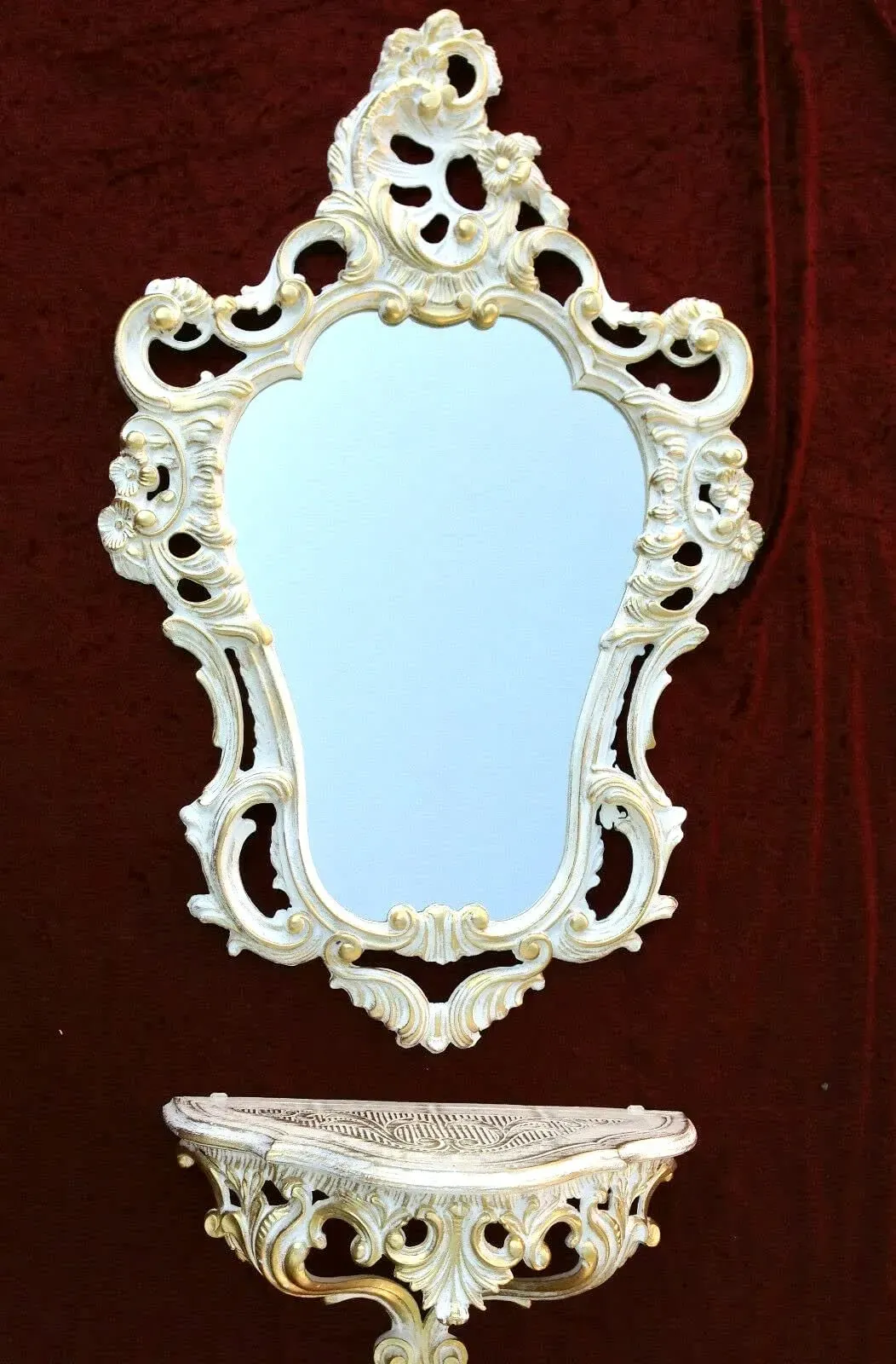 Verfügbarkeit: Gewöhnlich versandfertig in 2 bis 3 Tagen - Kategorie: Spiegel - Artissimo - GTIN:6036581032165 - Artissimo Barock Wandspiegel WEIß-Gold Oval mit Wandkonsole, Konsole 50x76cm Wanddeko Wandspiegel + Konsole dualcolour - 84,90 Euro bei Amazon Marketplace Home - gefunden von billiger.de Eine große Wandkonsole mit Wandspiegel im Barock-Stil aus den 60er Jahren, gefertigt in Italien aus Resin, für Vintage-Liebhaber. ![]() ![]() Große Wandkonsole - mit Wandspiegel eBay in Barok;60er Jahre Italien aus Resin