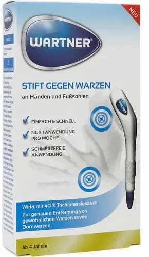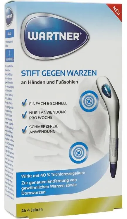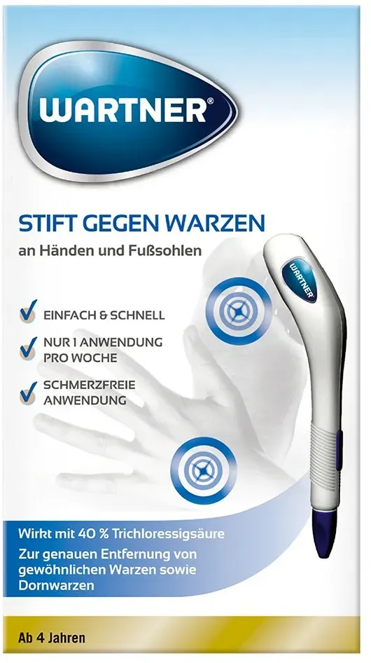 EAN: 4150159995064 - WARTNER Hand- und Fußwarzen Stift 1 St. - Warzenmittel, Entfernung von Warzen Stift für eine sanfte, punktgenaue Entfernung von Warzen Warzen sind nicht nur unschöne Hautveränderungen, sondern können auch eine schmerzhafte Angelegenheit sein. Der Warzenstift von Wartner bietet eine sanfte und schmerzfreie Methode, unangenehme Warzen loszuwerden. Die hochdosierte Lösung mit 40 % Trichloressigsäure kann mit dem Mikrodosierungsapplikator exakt aufgetragen werden. Mit der Zeit wird das Warzengewebe Schicht für Schicht abgetragen, bis nur noch gesunde Haut übrig ist . Somit bietet der Wartner Stift gegen Warzen eine schonende Methode zur Warzenbekämpfung für Kinder ab n und empfindliche Menschen und für alle, die eine Vereisung vermeiden möchten. Punktgenaue Anwendung zum Entfernen von Warzen, Fuß- und Dornwarzen Sanft und unkompliziert - nur eine Anwendung pro Woche nötig Geeignet für Erwachsene & Kinder ab n, die an Händen und Fußsohlen schmerzempfindlich sind Sichtbare Ergebnisse schon nach einer Woche - ganz ohne Vereisung Hochdosierte Lösung mit 40% Trichloressigsäure Pflichttext: WARTNER Stift gegen Warzen 2.0 Zur Behandlung von gewöhnlichen Warzen (Verrucae vulgares) und Dornwarzen (Verrucae plantares) an Händen und Fußsohlen. Nicht für die Behandlung von Dellwarzen geeignet. Das ist ein Medizinprodukt. Gebrauchsanweisung beachten. über Wirkung und mögliche unerwünschte Wirkungen informieren Gebrauchsanweisung, Arzt oder Apotheker. - bei aponeo.de ... ![]() ![]() Perrigo Wartner Stift gegen Warzen 2.0